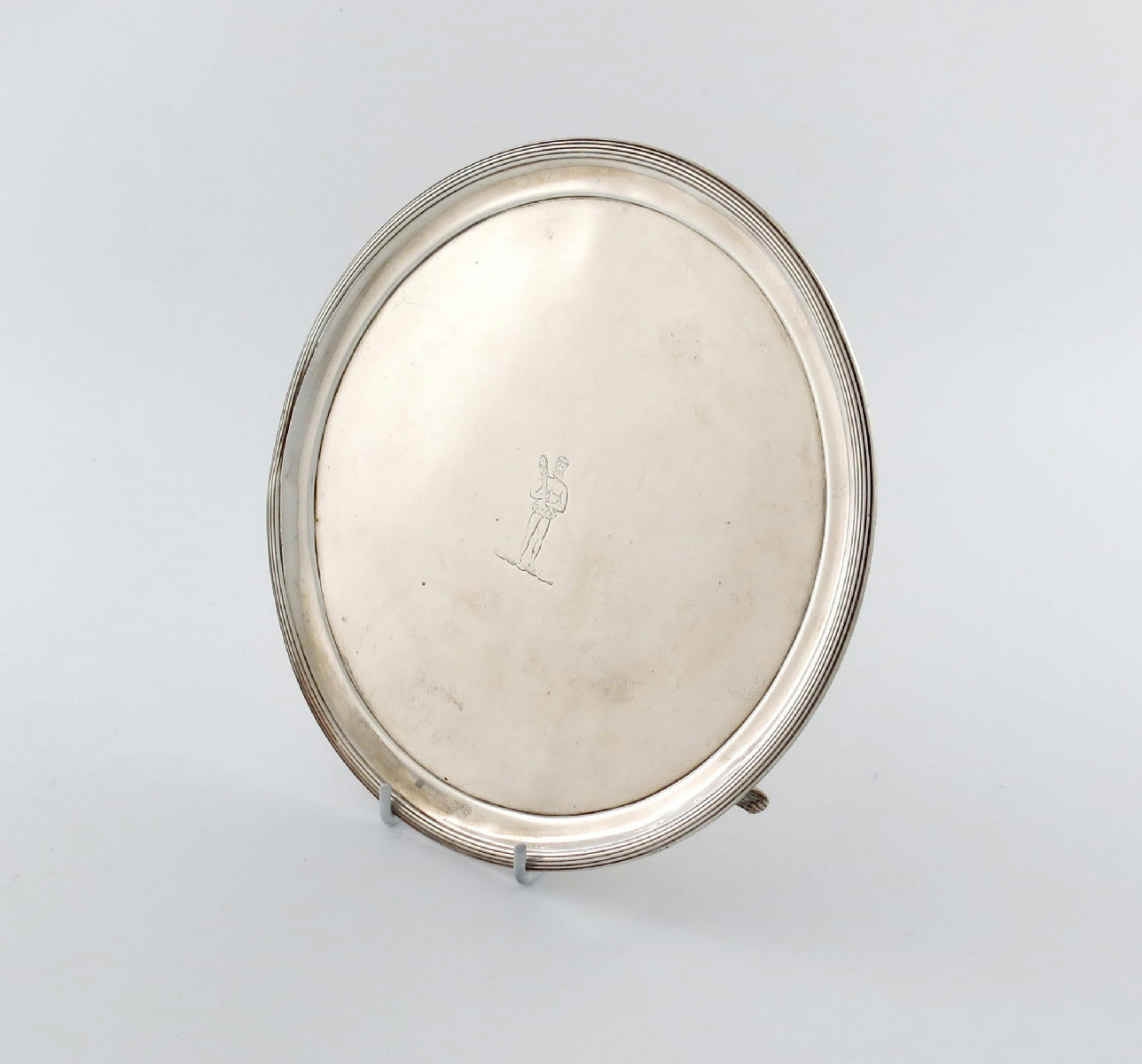 circular form, reeded border, the centre with a crest, on three fluted bracket feet, diameter 22.8cm, approx. weight 12oz.