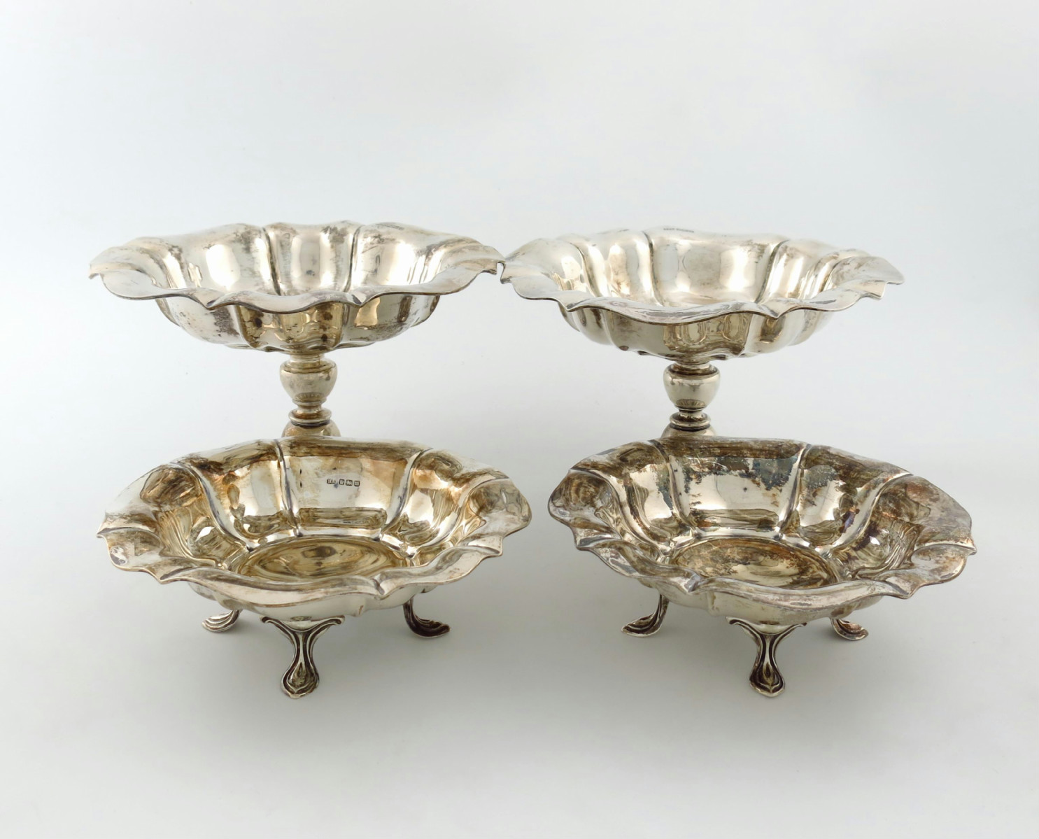 two sizes, lobed circular form, one on a raised pedestal base, the other of four scroll feet, height of larger 15.2cm, diameter of smaller 19.4cm, approx. weight 55oz. (4)