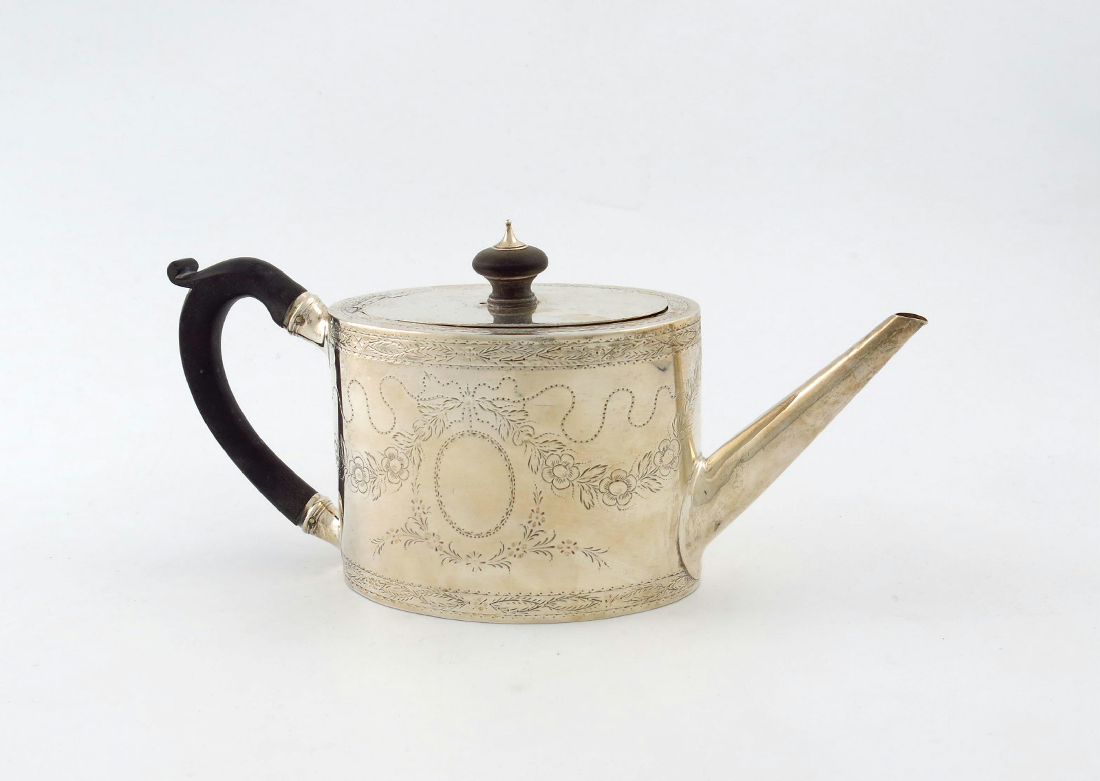 oval form, bright-cut foliate decoration, flush-hinged cover with a knop finial, scroll handle, with a vacant cartouche, length handle to spout 26.7cm, approx. weight 15oz.