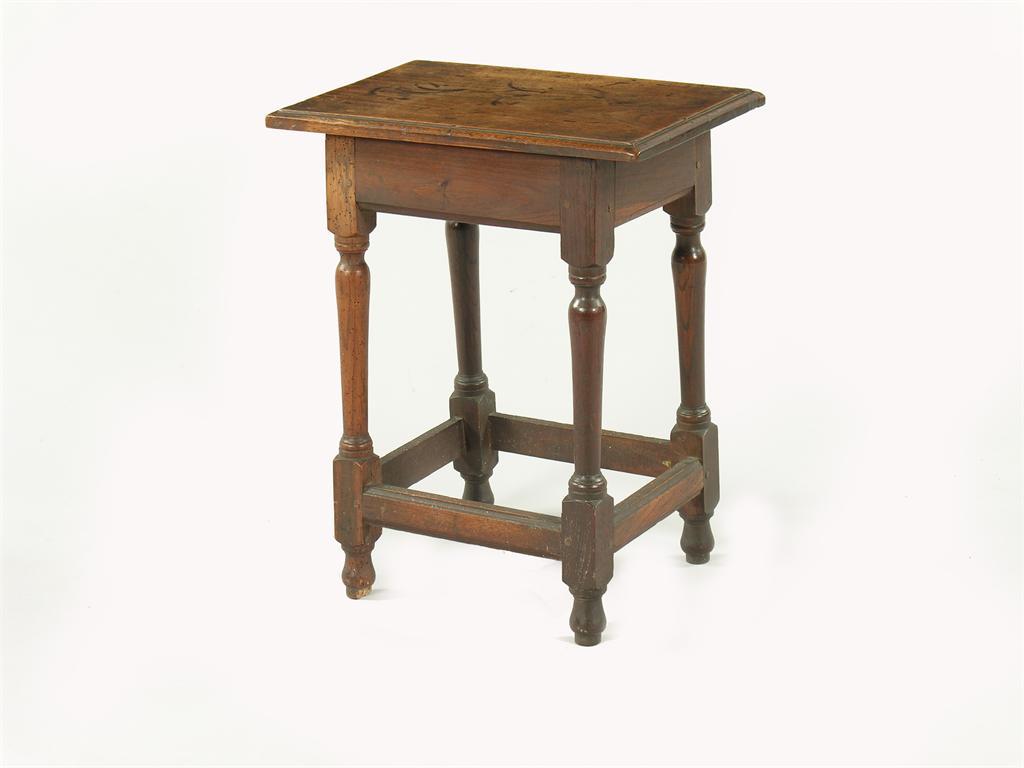 An 18th century oak high joined stool, the moulded edge rectangular top on turned tapering and block legs, 23.75in (60.4cm) w, 13in (33cm) d.