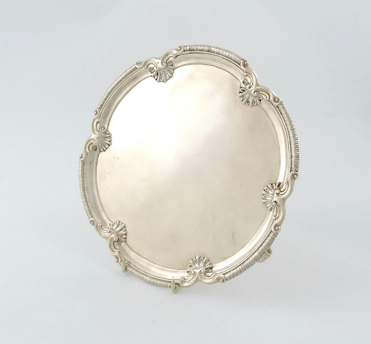 shaped circular form, gadroon, scroll and shell border, on three scroll bracket feet, diameter 25.8cm, approx. weight 20.3oz.