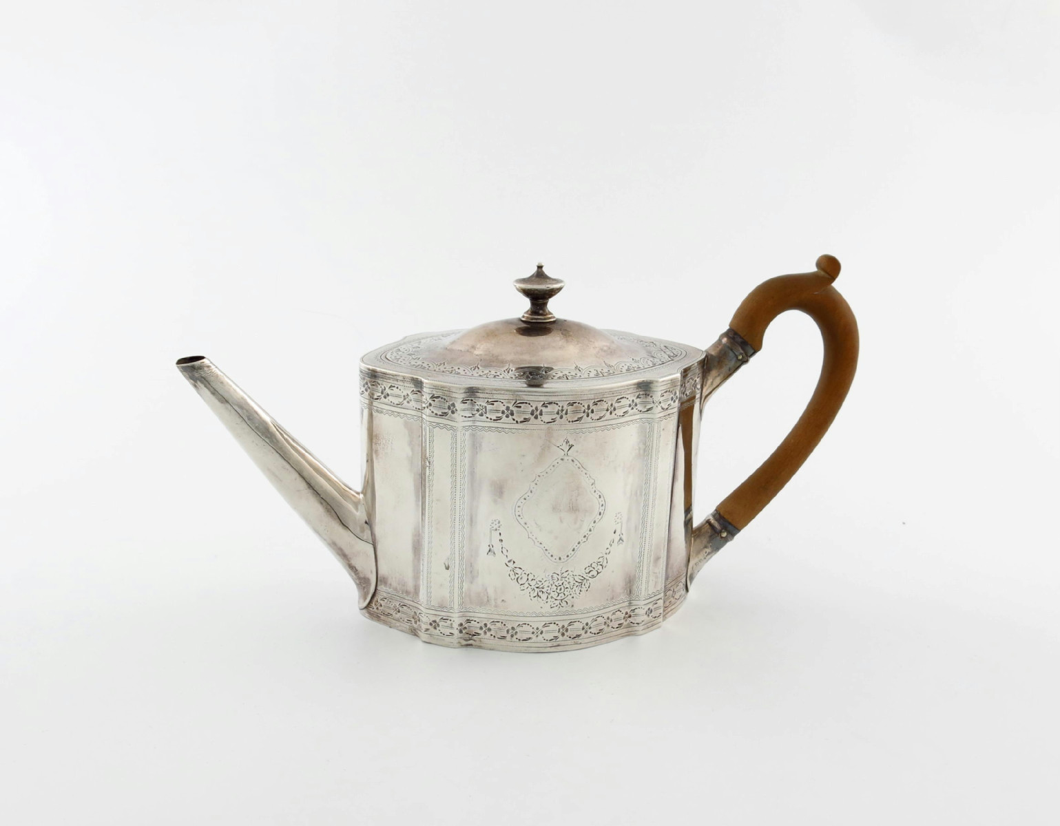 oval form, with engraved decoration, two vacant cartouches, urn finial, length handle to spout 17cm, approx. weight 13oz.