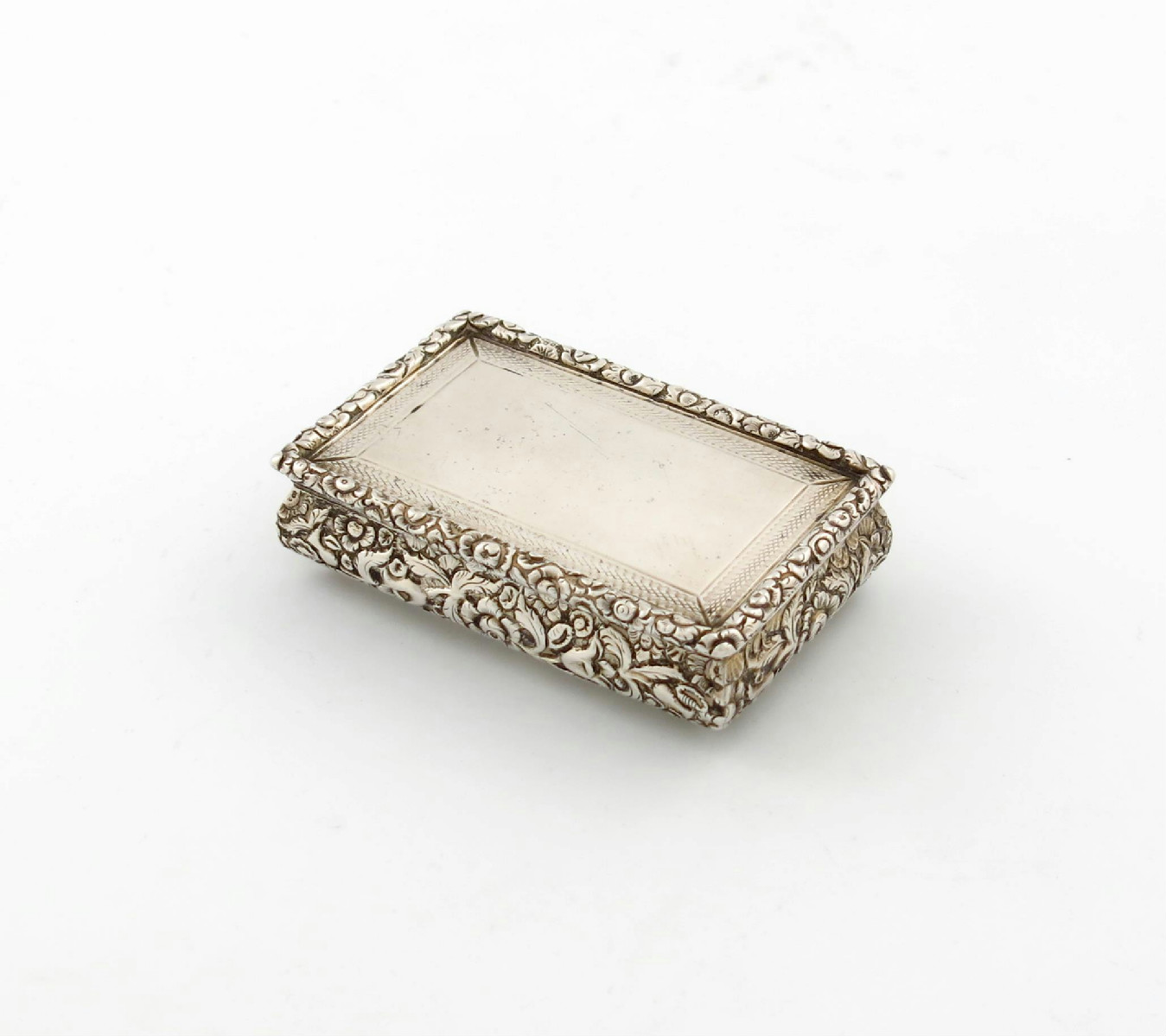 rectangular form, chased foliate decoration, engine-turned decoration, gilded interior, length 8.5cm, approx. weight 4oz.