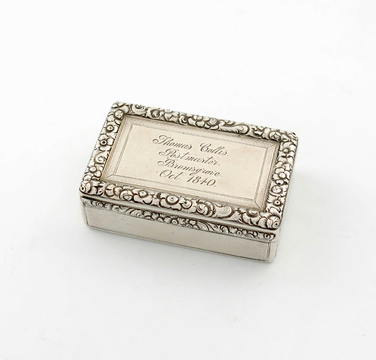 rectangular form, chased foliate border, engine-turned sides and base, the hinged cover inscribed 'Thomas Collis, Post Master, Bromsgrove, 1840' gilded interior, length 9.9cm, approx. weight 8.4oz.