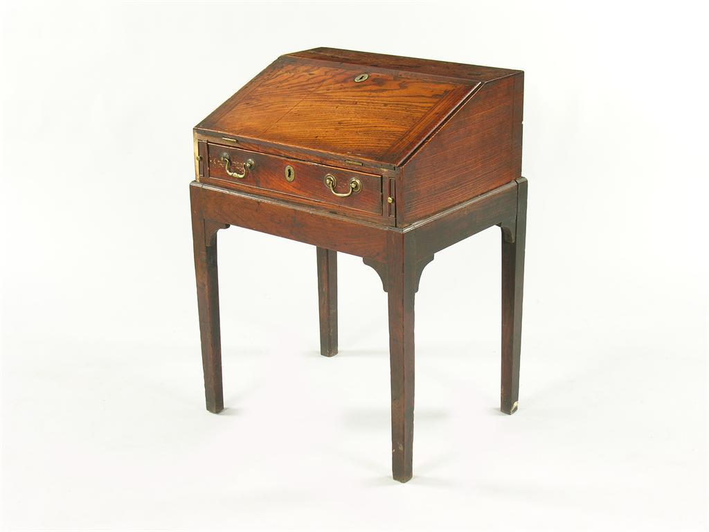 An 18th century ash desk on stand, the banded fall to two drawers and pigeon holes, the frieze drawer with later differing handles, 33.75in (85.8cm) h, 25in (63.5cm) w, 20in (50.8cm) d.
