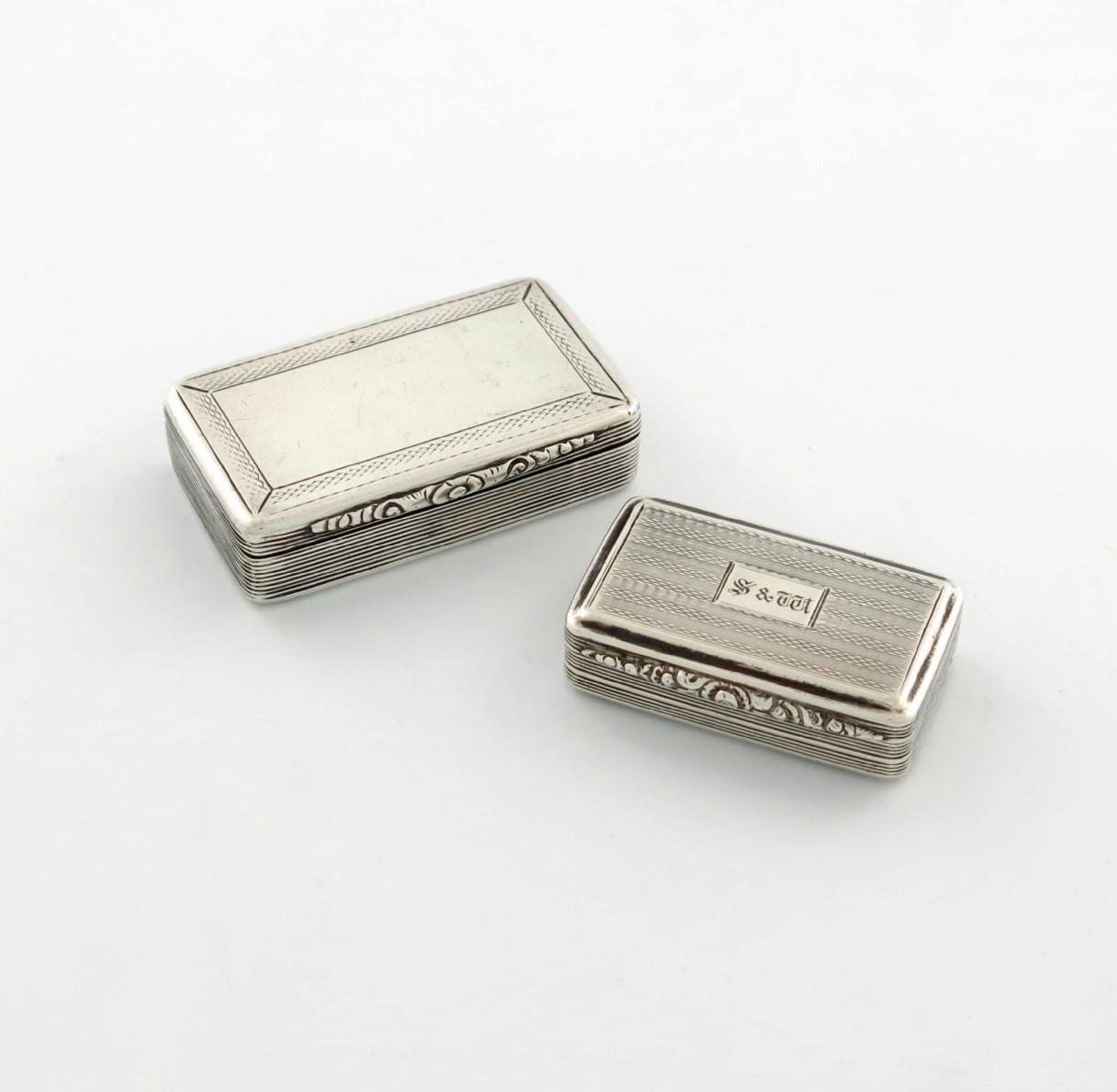 rectangular form, engine-turned decoration, the hinged cover with an initial, length 5.4cm, plus an early-Victorian silver snuff box, by Francis Clark, Birmingham 1840, rectangular form, engine-turned decoration, the cover erased, length 6.8cm, approx. total weight 3.4oz. (2)