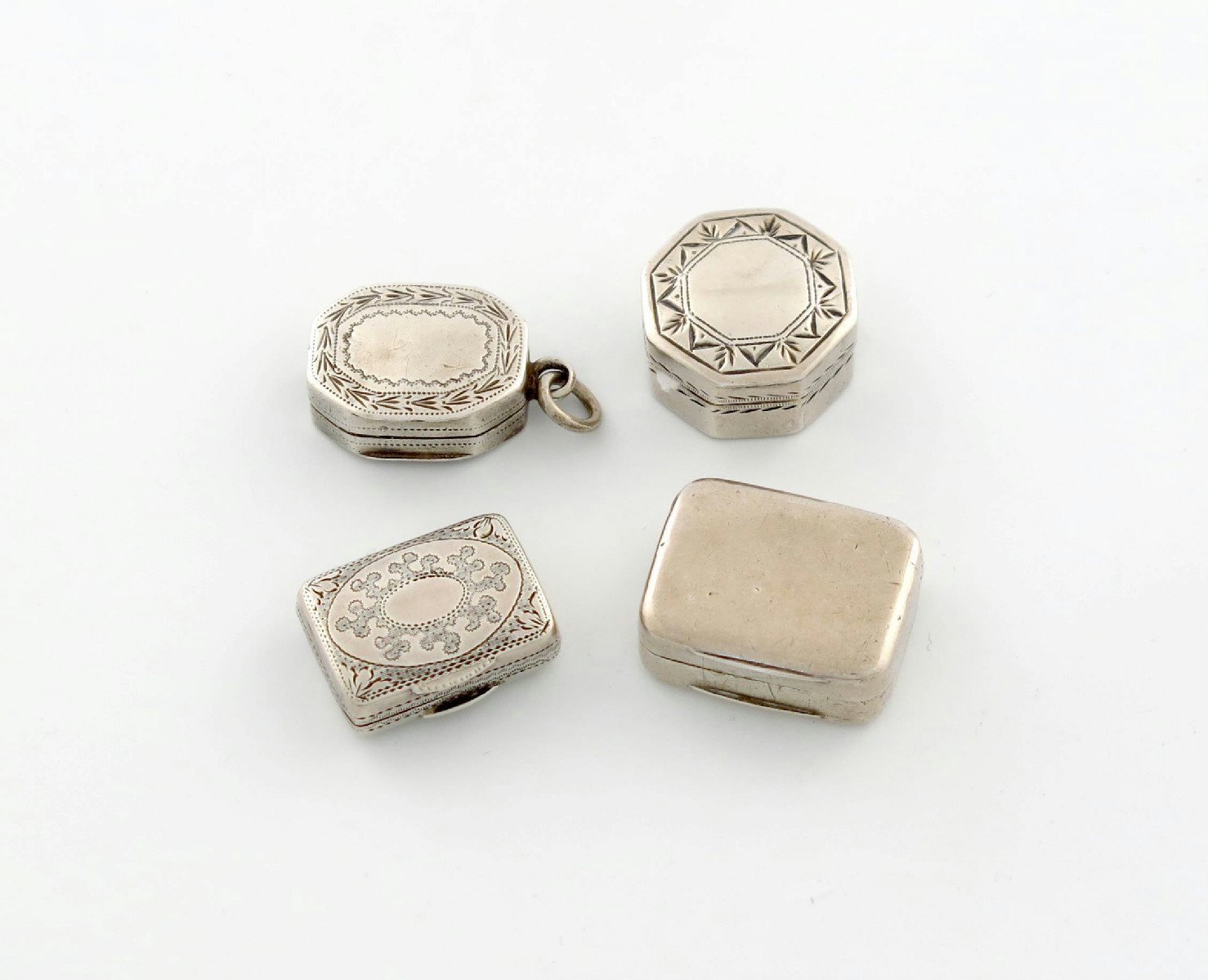 comprising: a George IV one, by Joseph Taylor, Birmingham 1822, rectangular form, engraved decoration, one of octagonal form, Birmingham 1799, plus one of rectangular form, and one other, approx. weight 1.1oz. (4)