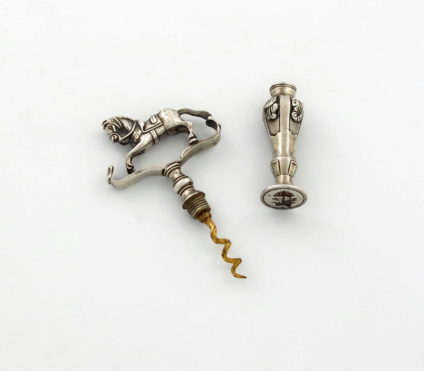 shaped baluster form, with foliate scroll motifs, the screw-off matrix base with a spike and the matrix with an early 19th century crest, the handle with a rocking-horse handle, gilded worm, height 9.5cm, approx. weight 1.6oz.