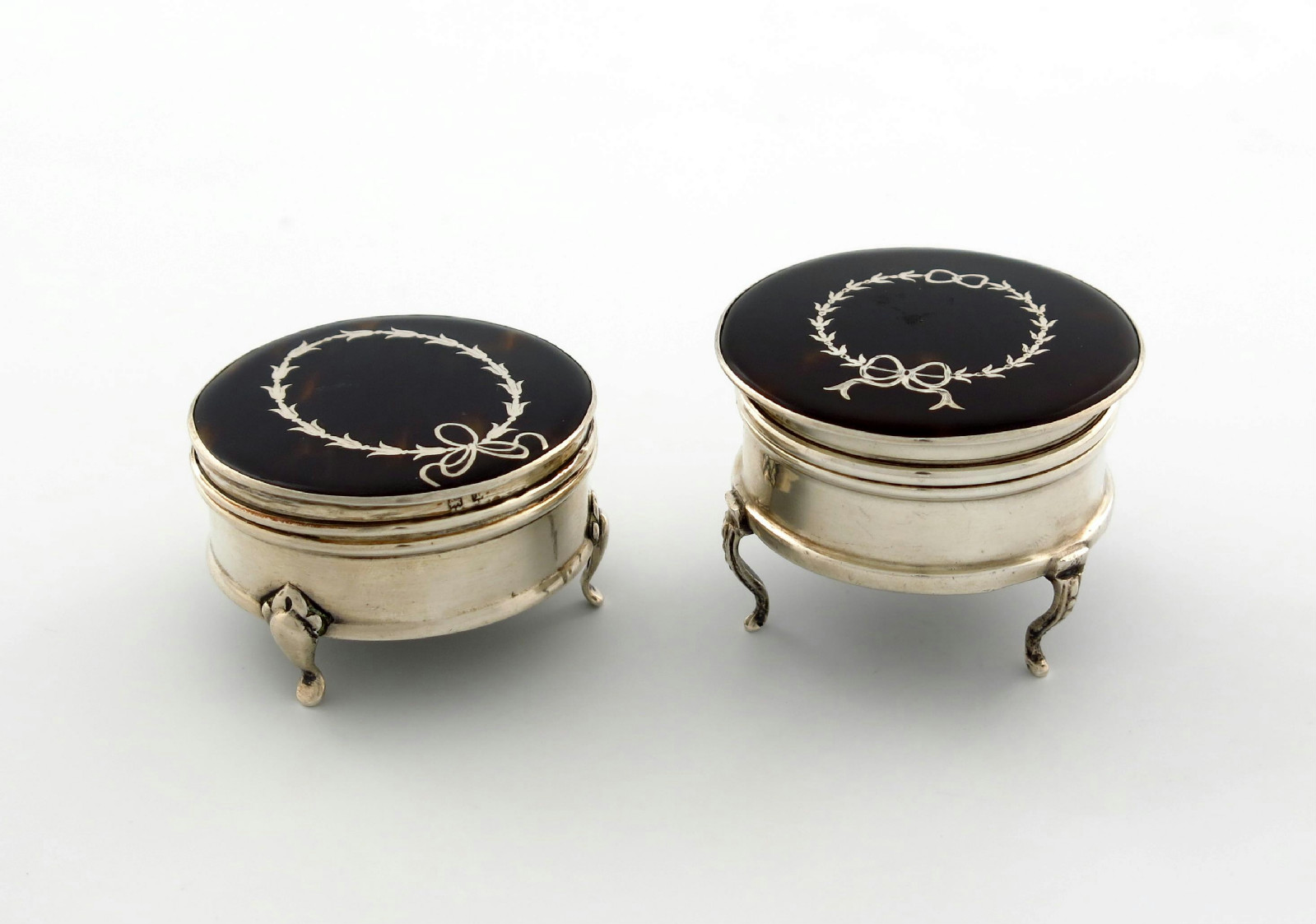 circular form, the hinged cover with inlaid decoration, on three scroll feet, plus another silver-mounted tortoiseshell trinket box, Collett and Anderson, London 1930, diameter 5.5cm and 5.3cm. (2)