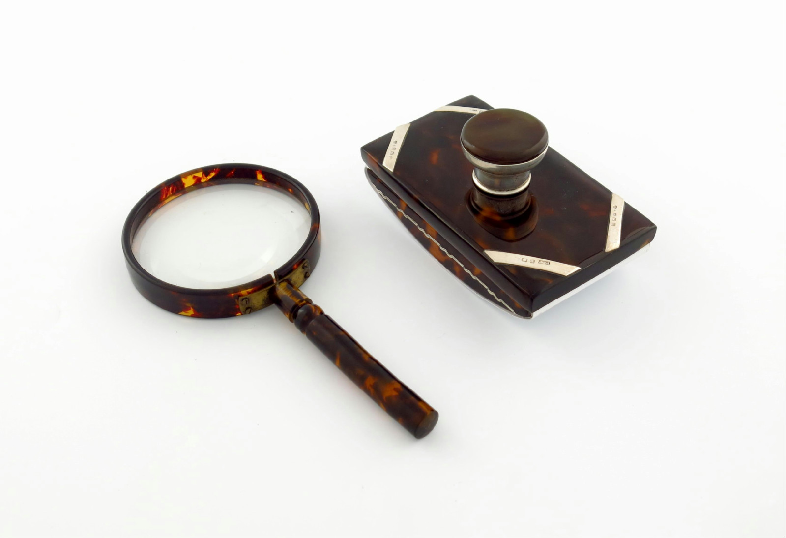 rectangular form, plain silver bands, length 12.8cm, plus a tortoiseshell magnifying glass, length 19.3cm. (2)