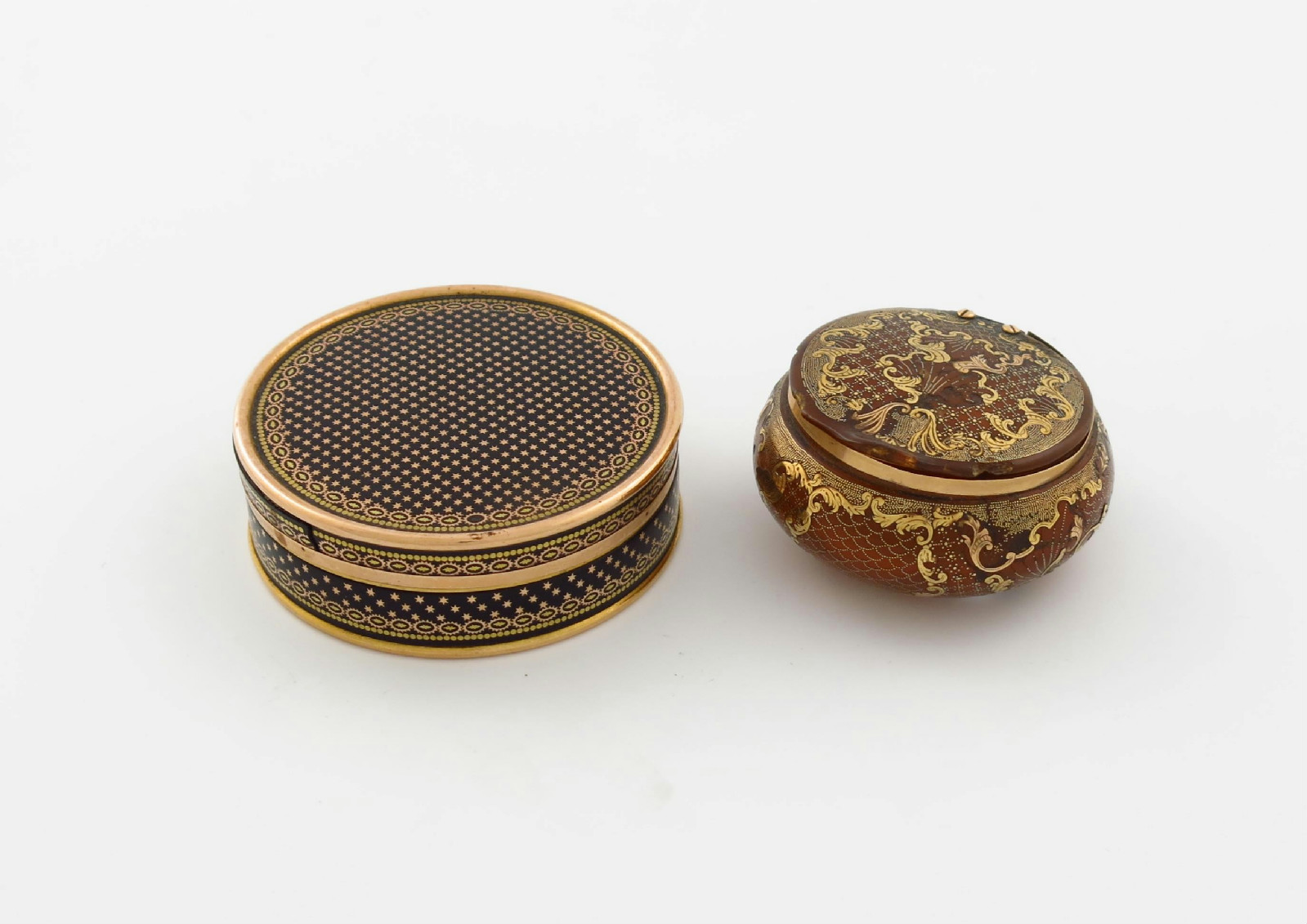 circular form, inlaid with scroll, lattice and gold stud work, hinged cover, damage and inlay missing, diameter 6.5cm, plus an early 19th century gold-mounted snuff box, circular form, inlaid with gold star decoration, plain mounts, damaged, diameter 7.8cm. (2)