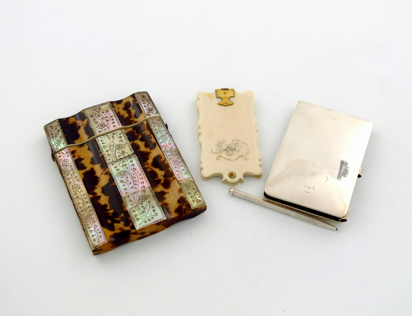 comprising: a silver notebook, by Crisford and Norris, Birmingham 1910, rectangular form, the pull-out pencil opens the case to reveal stamp holders, length 8.8cm, plus an ivory aide memoire, and a tortoiseshell and mother-of-pearl card case. (3)