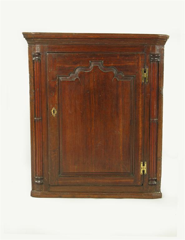 A George III oak hanging corner cupboard, with three shaped shelves, 38.5in (98cm) h, 33in (84cm) w, 18.5in (47cm) d.