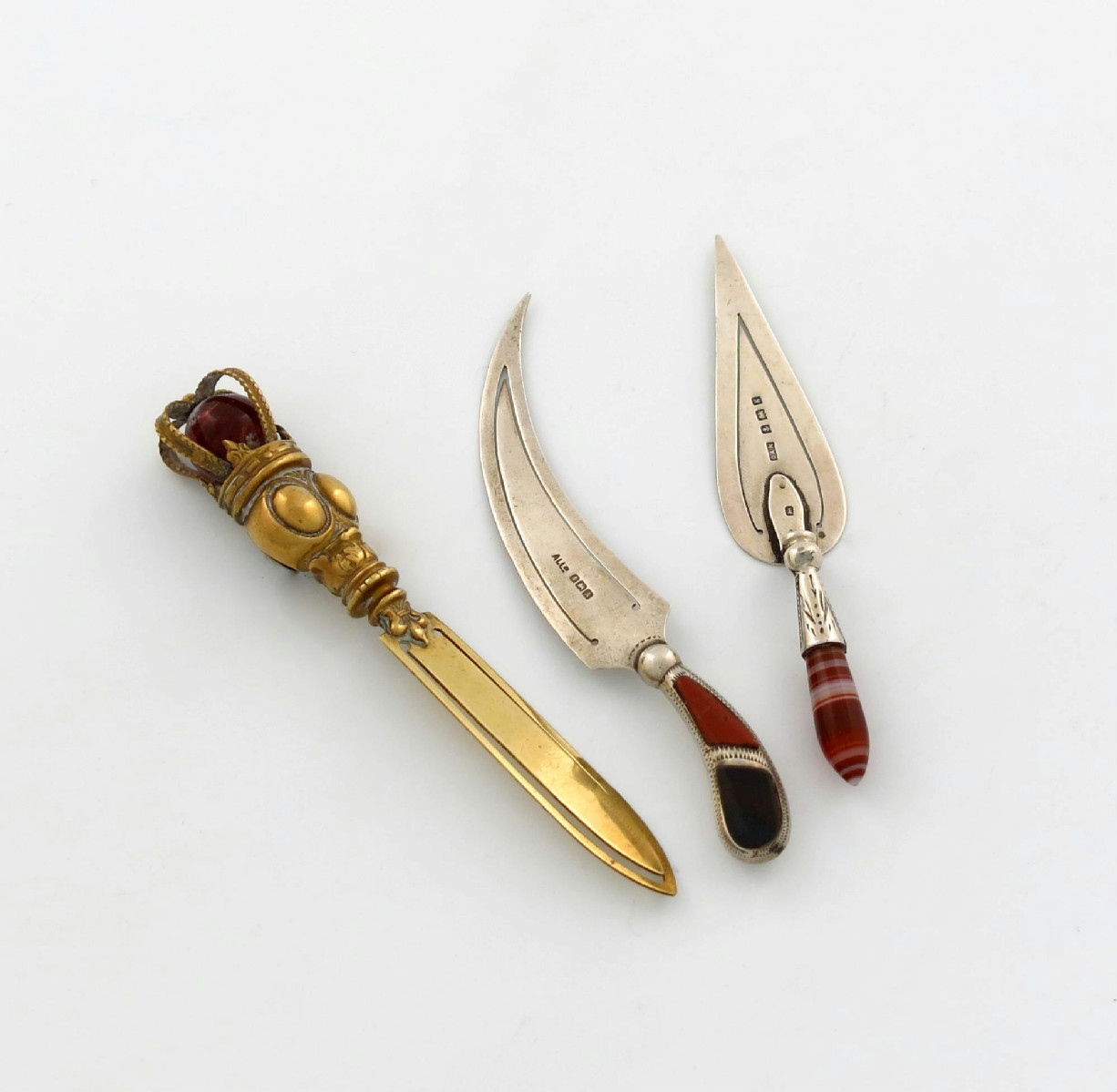comprising a silver one of dagger form, the handle set with hard stones, by Lovekin and Allday, Birmingham 1925, plus one of trowel form with a banded agate handle, by Crisford and Norris, Birmingham 1906, and a gilt metal commemorative page marker. (3)