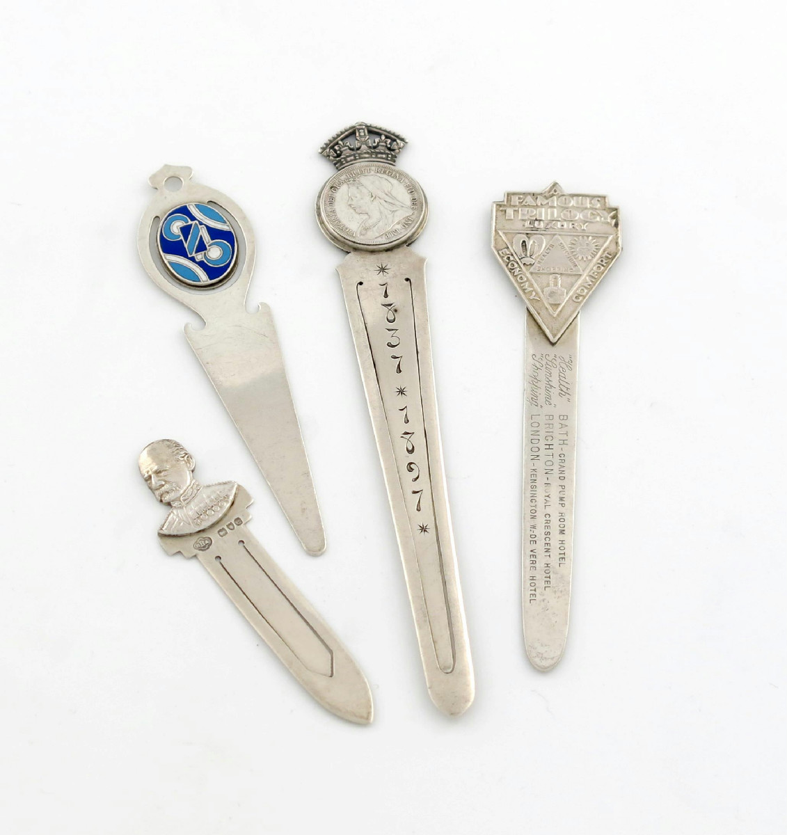 comprising: one celebrating Queen Victoria's Diamond Jubilee, London 1896, one with the bust of Lord Roberts, London 1900, one with enamel decoration and one with the terminal 'A Famous Trilogy - Luxury, Economy and Comfort', approx. weight 2.4oz. (4)