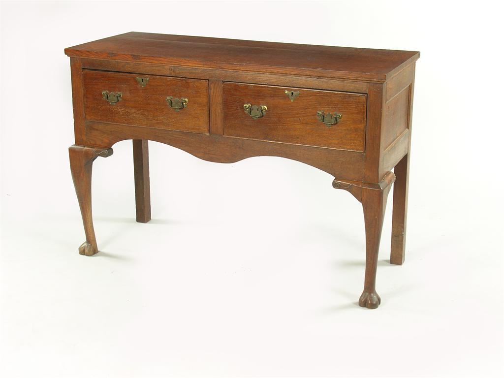 An oak dresser, the boarded top on carved bracketed tapering legs to trefoil feet, early 20th century, 33in (84cm) h, 49in (124.5cm) w, 18.75in (47.5cm) d.