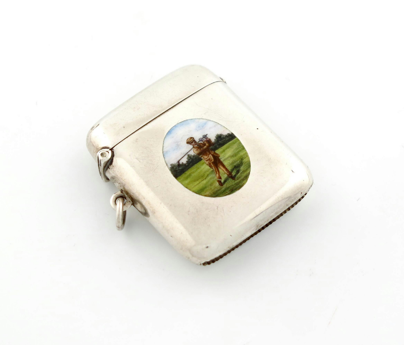 rectangular form. hinged cover, the side with an enamel plaque of a golfer, length 5.5cm, approx. weight 1.7oz.