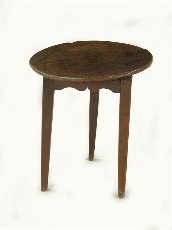 A late George III oak cricket table, the circular boarded top above a shaped frieze, 26in (66cm) h, 22.75in (58cm) dia. One leg replaced in fruitwood.