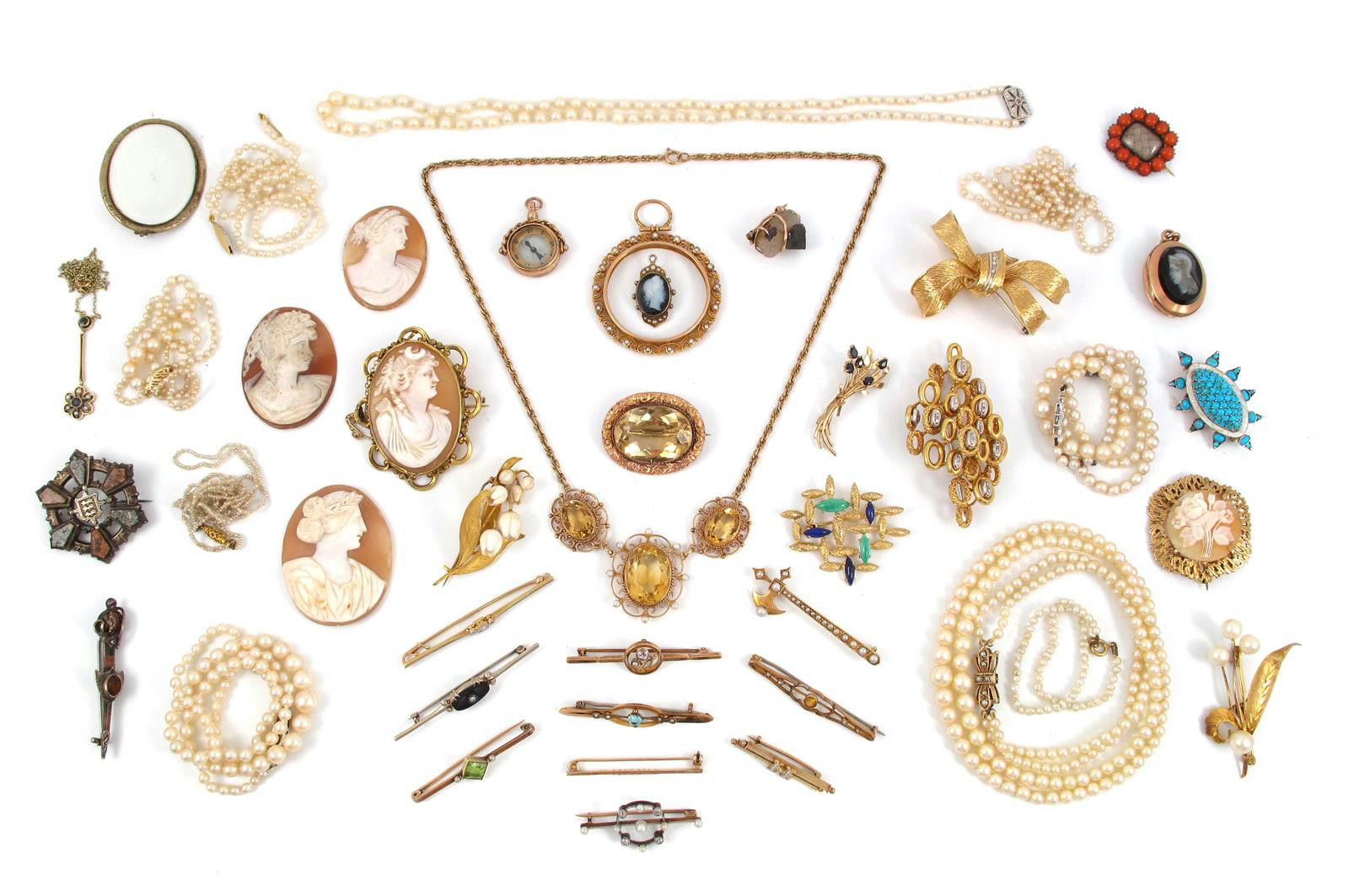 Six assorted cultured pearl necklaces and a bracelet with extra pearls, a gold necklace mounted with three oval citrines, a gold spinning compass pendant, an early 19th century gold brooch, mounted with a large oval citrine, a diamond set textured gold bow brooch, a modern gold brooch formed with plain and textured oval sections, some mounted with diamonds, a Victorian double sided gold locket mounted with a carnelian and hard stone cameo and assorted brooches.