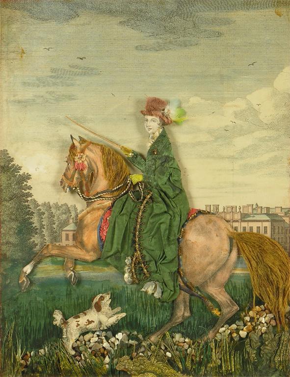 'Her Majesty, On her favourite Charger,' a collage by Mrs Townshend, inscribed to verso, 11x 8in (28 x 20cm) in a birds' eye maple frame.