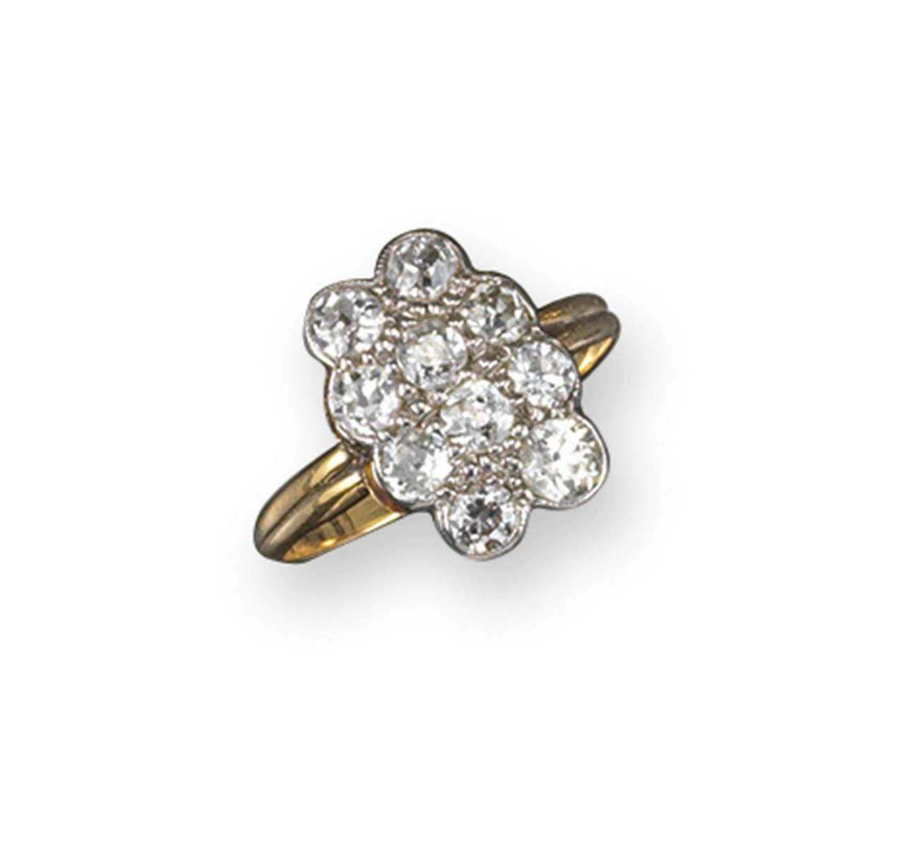 A diamond cluster ring, set with ten circular cut diamonds in platinum and gold. Size K 1/2.