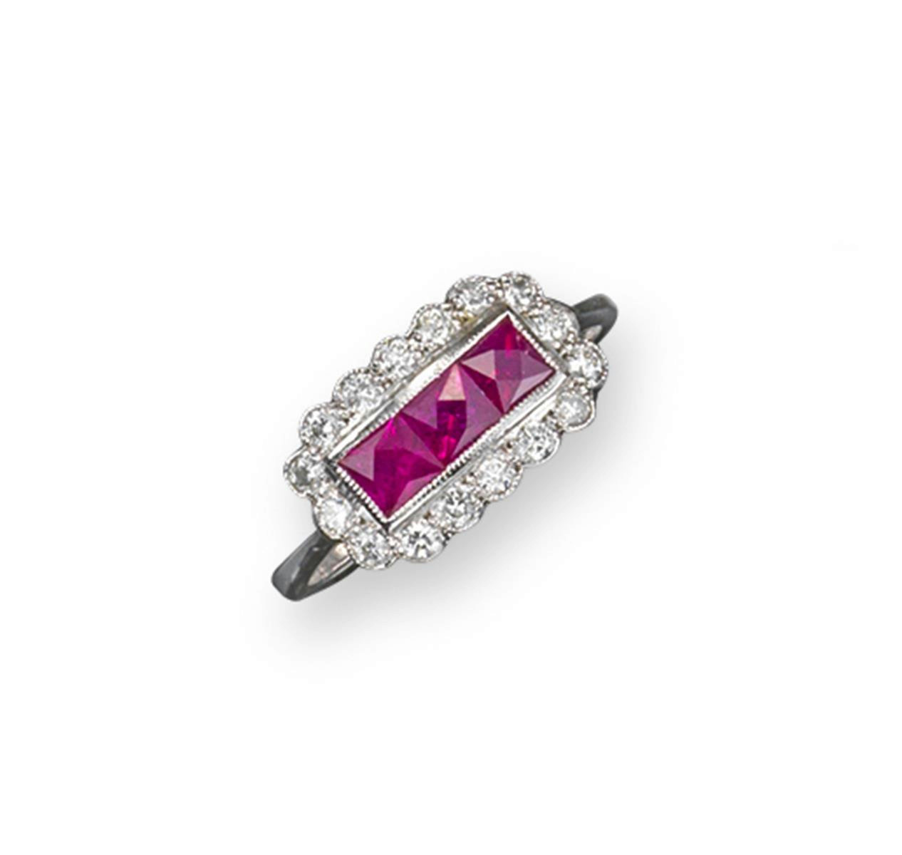A ruby and diamond set 18ct gold ring, millegrain set with three square-shaped rubies within a border of round brilliant-cut diamonds in white gold. Size O.