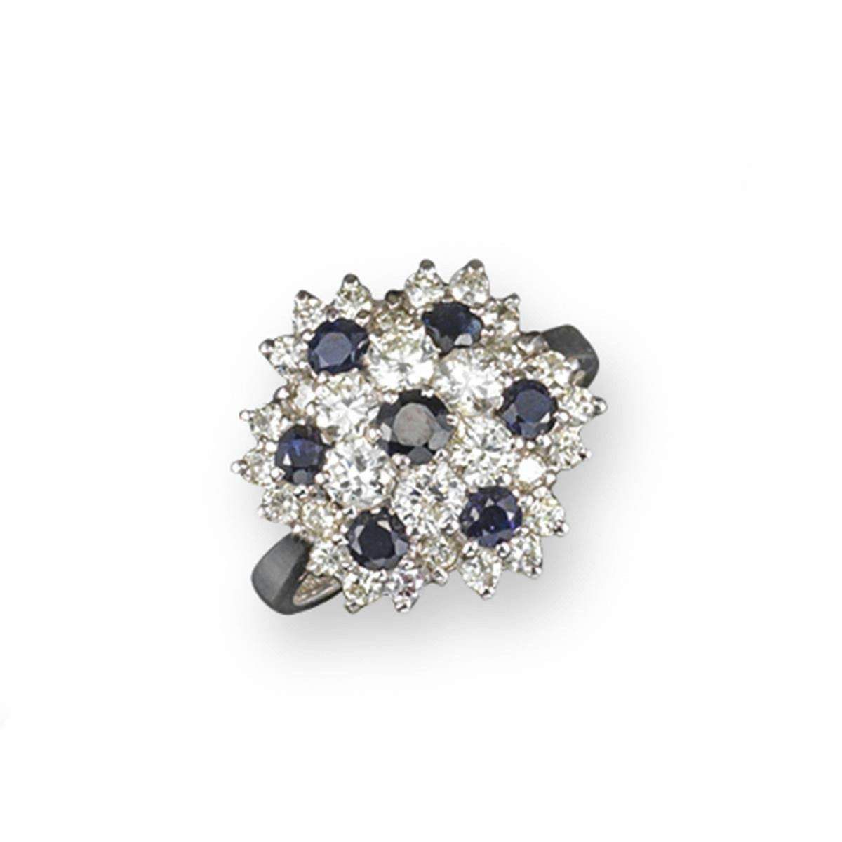 A sapphire and diamond cluster ring, set in white gold. Size N.