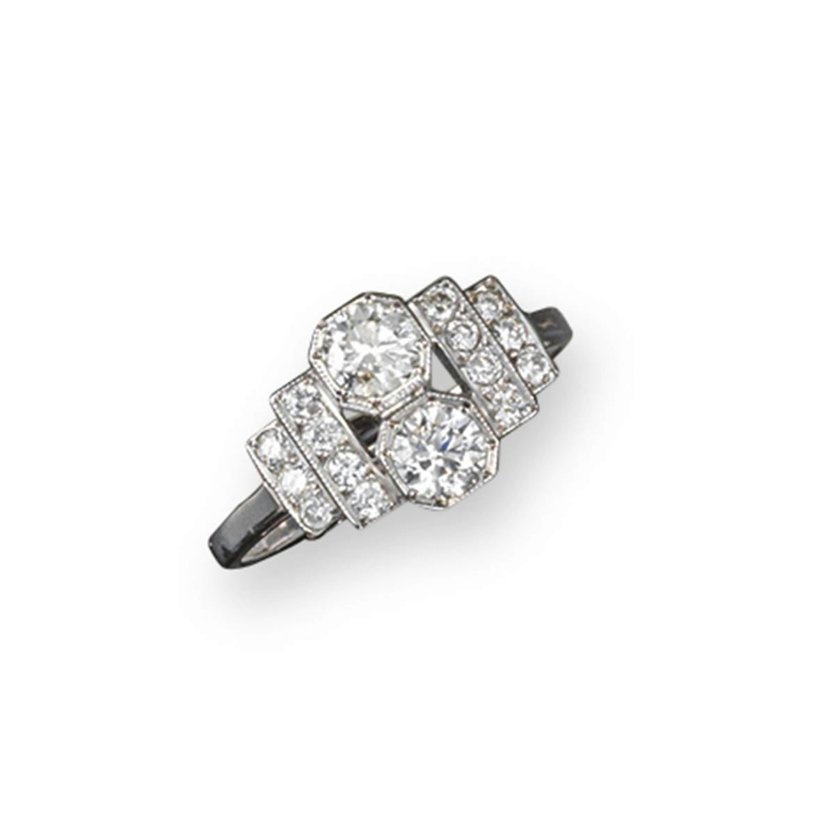A diamond set white gold ring, set with two round brilliant cut diamonds and seven smaller diamonds to each shoulder. Size O 1/2.