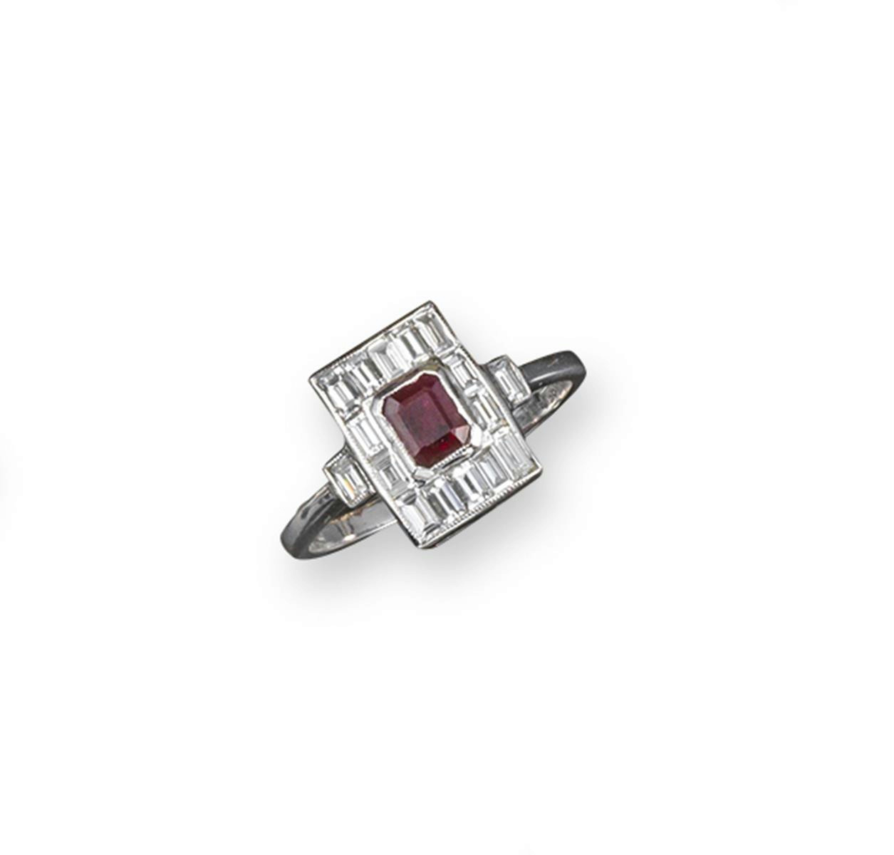 A ruby and diamond plaque ring, the emerald-cut ruby is set within a surround of baguette-shaped diamonds in white gold. Size O.