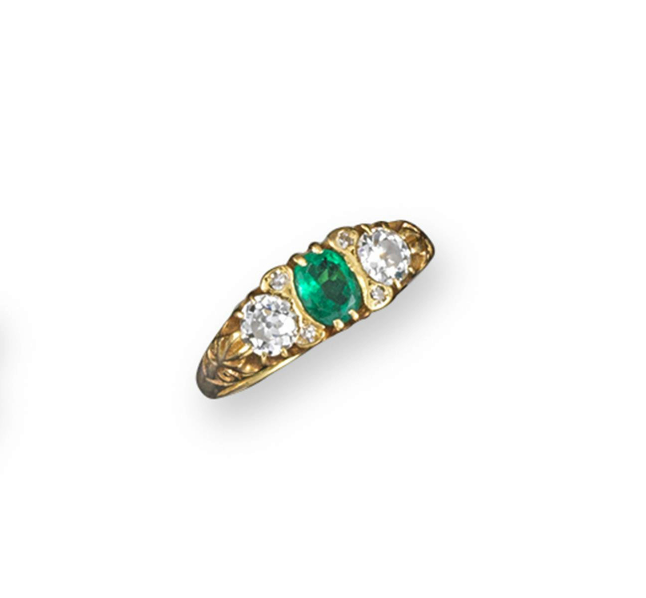 An emerald and diamond-set three stone ring, the oval-shaped emerald is set with two circular-cut diamonds in yellow gold. With four smaller diamonds. Size L 1/2.