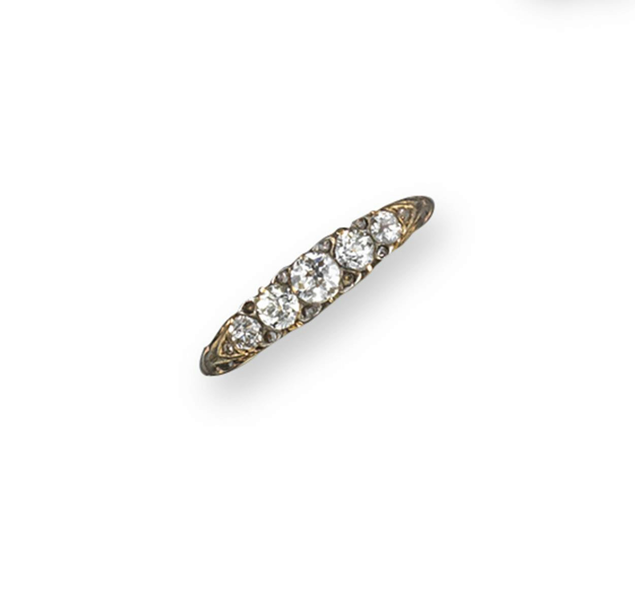 A diamond-set five stone ring, the five graduated old circular-cut diamonds are set in yellow gold with scroll carved shoulders. Size N 1/2.