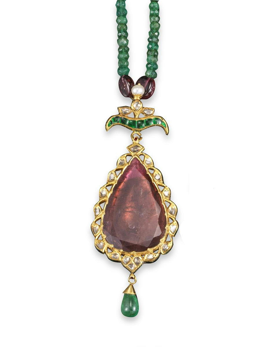 An Indian pendant, the large pear-shaped pink tourmaline is set within a surround of diamonds in gold. With emerald bead pendant and suspended from a diamond and pearl-set gold upper section. Closed back gold mount with enamel decoration to the reverse. On a faceted emerald and cabochon pink tourmaline bead necklace. The pendant 10.5cm high.