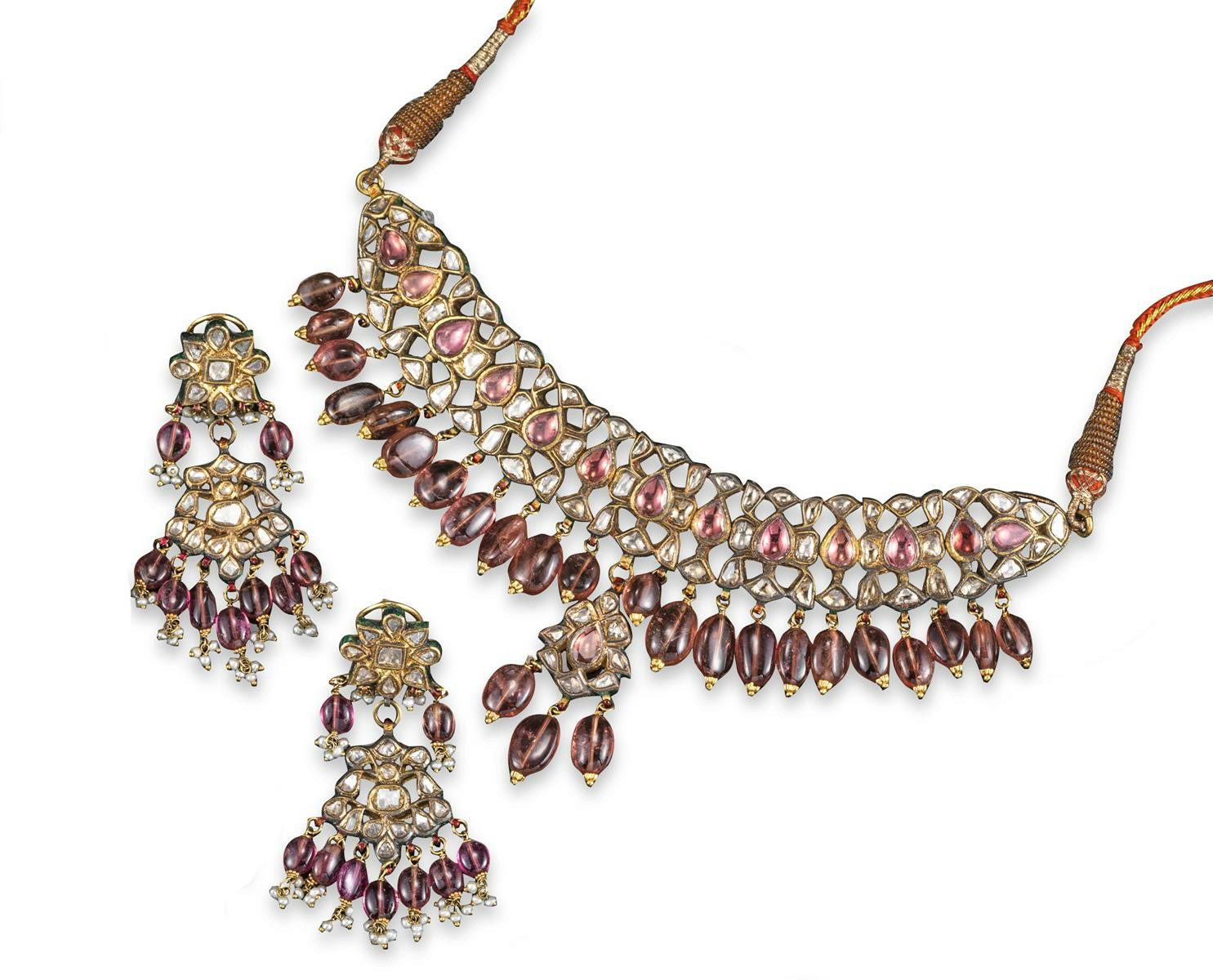 A Indian necklace with matching earrings, the gold pierced necklace set with a line of pear-shaped pink tourmalines with borders of diamonds, all in closed back mounts with a fringe of pink tourmaline beads and elaborate enamel decoration to reverse. The matching gold earrings set with diamonds, pink tourmaline cabochons and seed pearls, with similar enamel decoration to the reverse. The main necklace section 14.5cm wide. The earrings 6cm long.