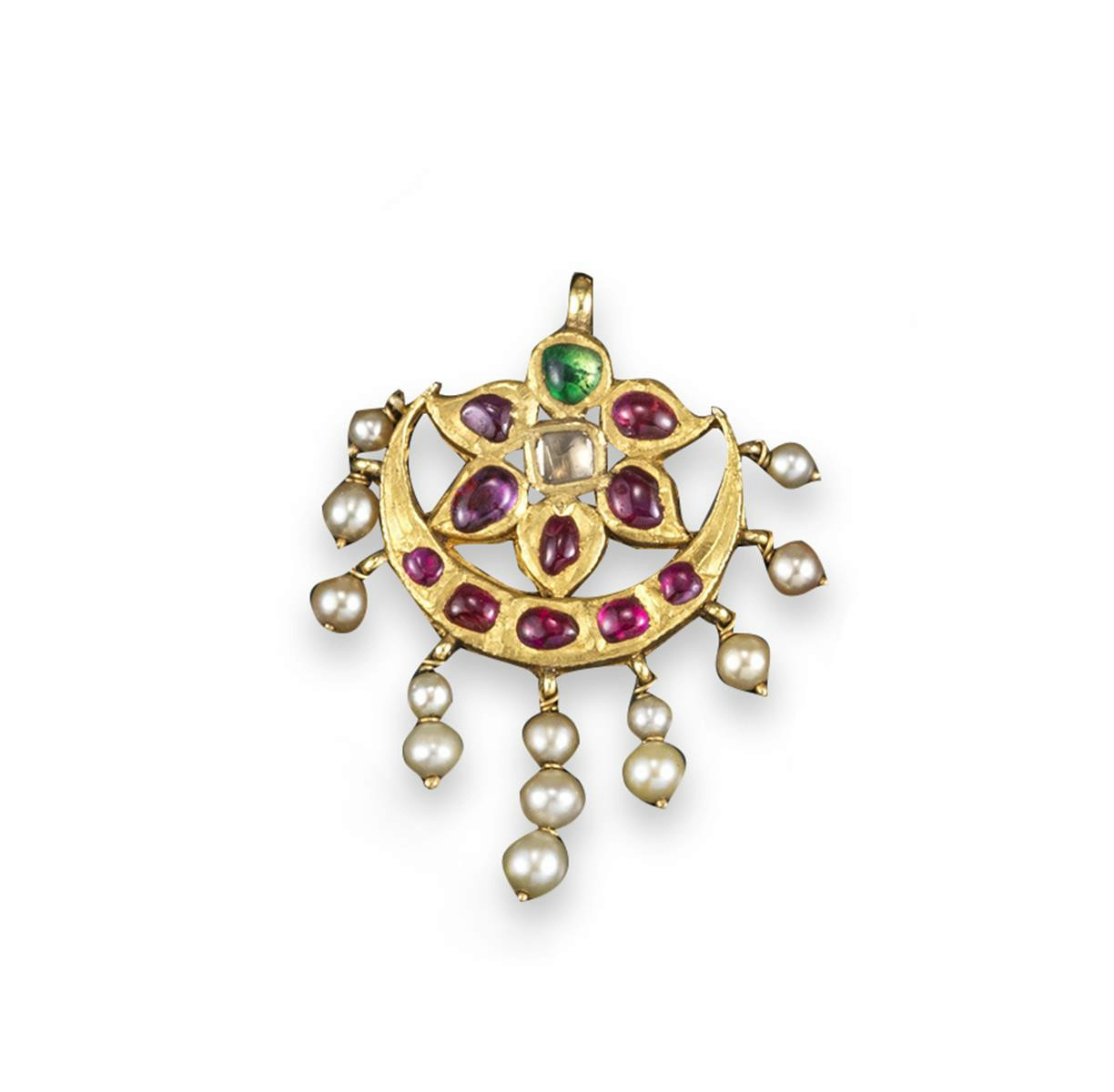 An 19th century Indian gem-set gold pendant, of crescent form supporting a flower head and centred with a table cut diamond, cabochon rubies, a cabochon emerald and pearls. 4.5cm high. Case by SJ Philips.