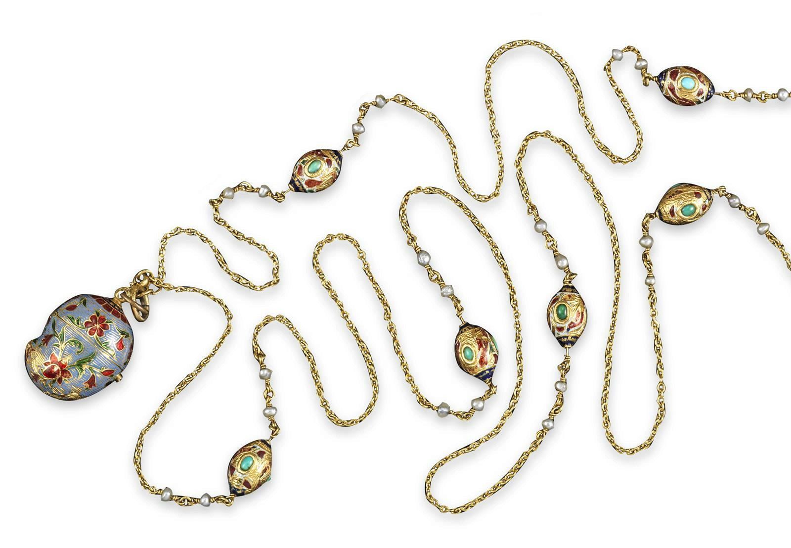 An Indian gold longuard chain, the fine oval links are spaced with seven ovoid gold mounts and with enamel decoration and with four seed pearls, suspending an Islamic palm form gold locket pendant with enamel foliate decoration. 145cm. 49g in total