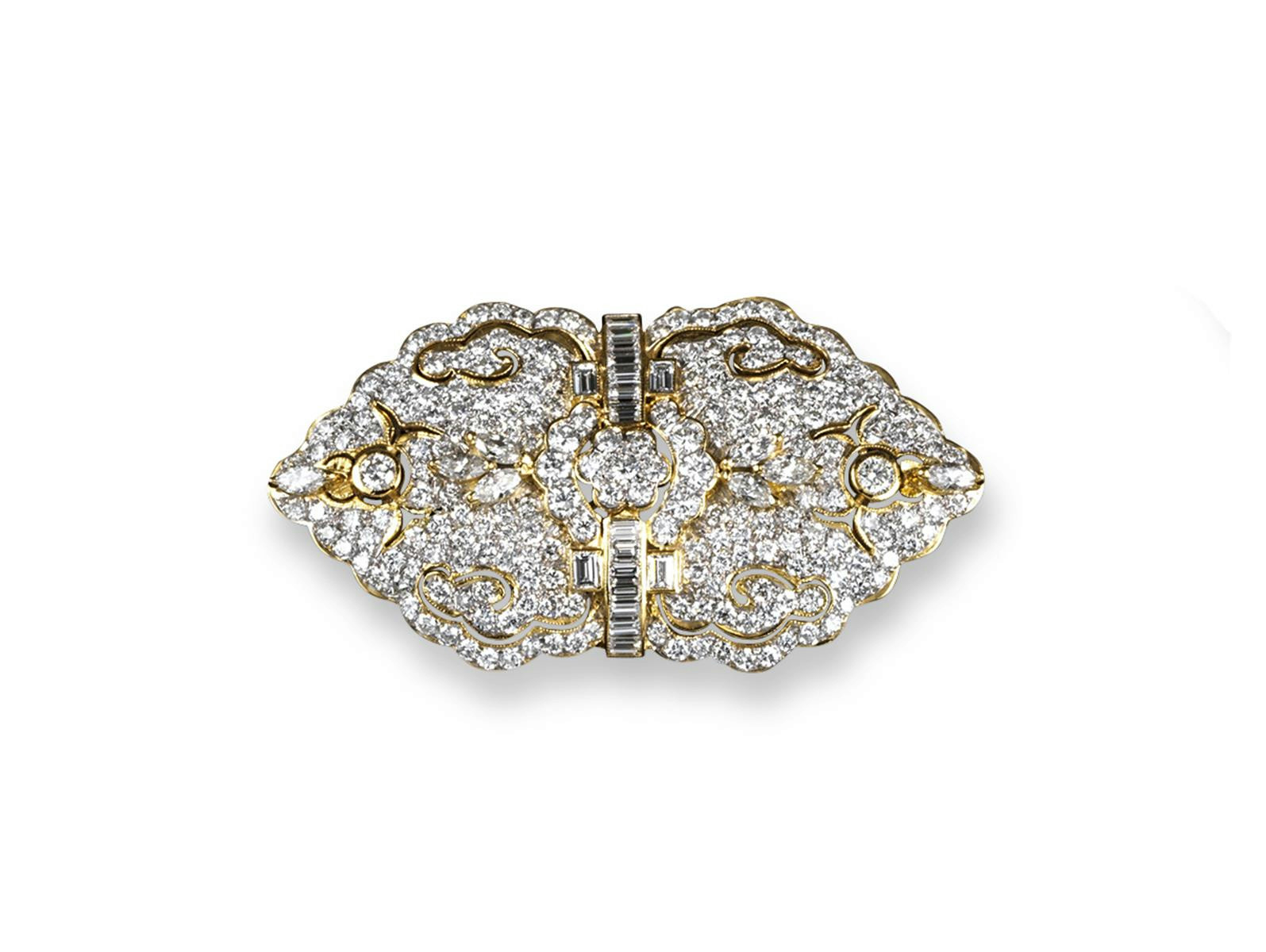 A diamond set plaque brooch pendant, set overall with circular-cut, marquise and baguette-shaped diamonds in gold. Scroll pierced mounts. 5.5cm long.
