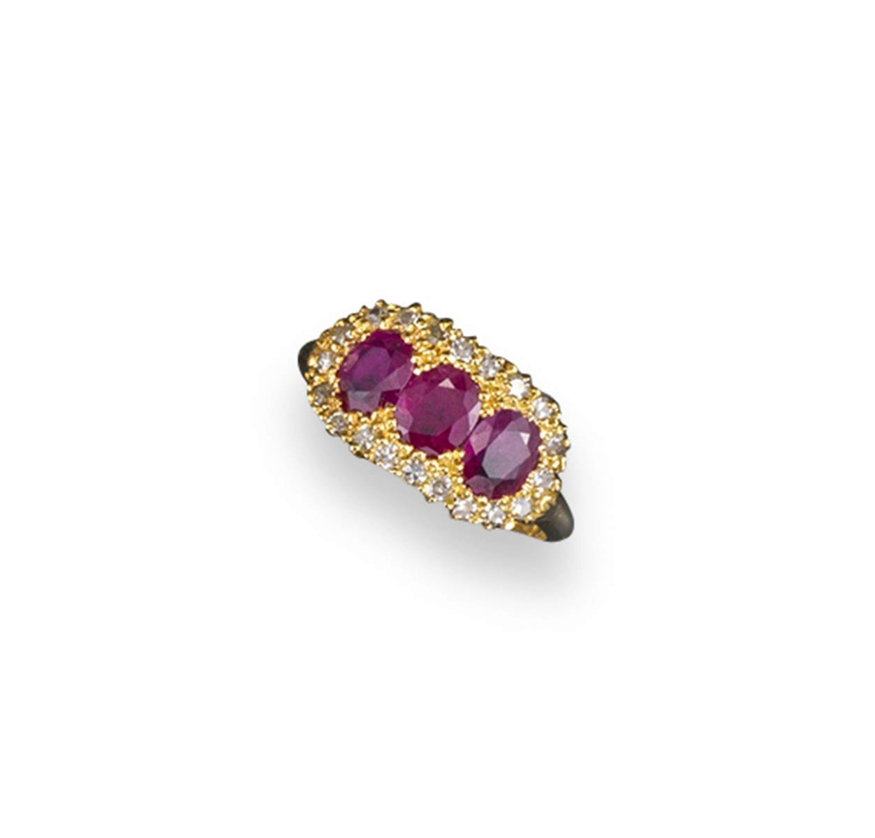 A ruby and diamond triple cluster ring