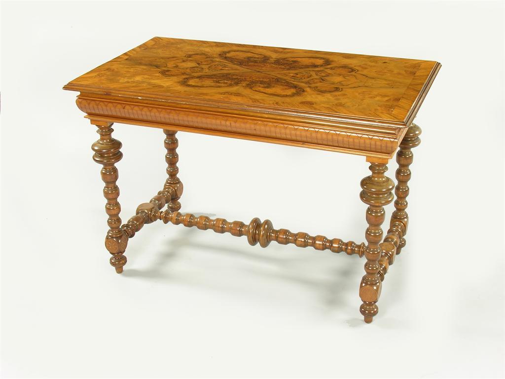 A continental centre table, the burr walnut quarter veneered top with crossbanding, 29in (73.6cm) h, 43.75in (111cm) w, 26in (66cm) d.