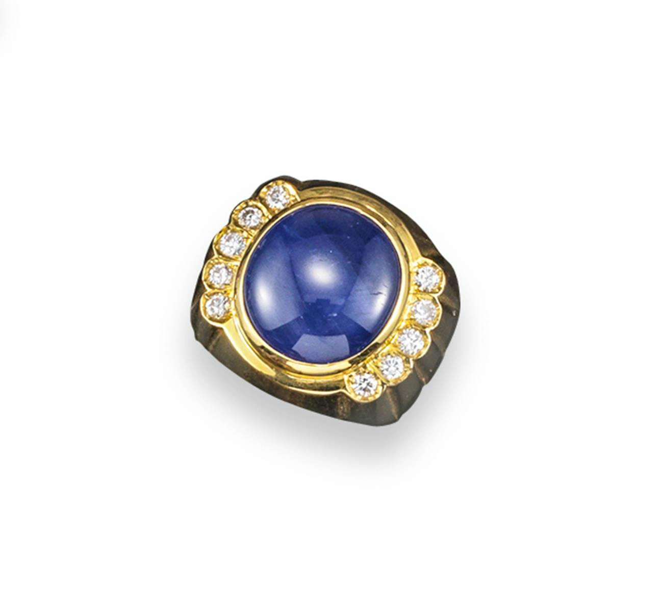 A cabochon sapphire and diamond ring, the slightly oval-shaped sapphire is set within borders of ten circular-cut diamonds in gold. Size N.