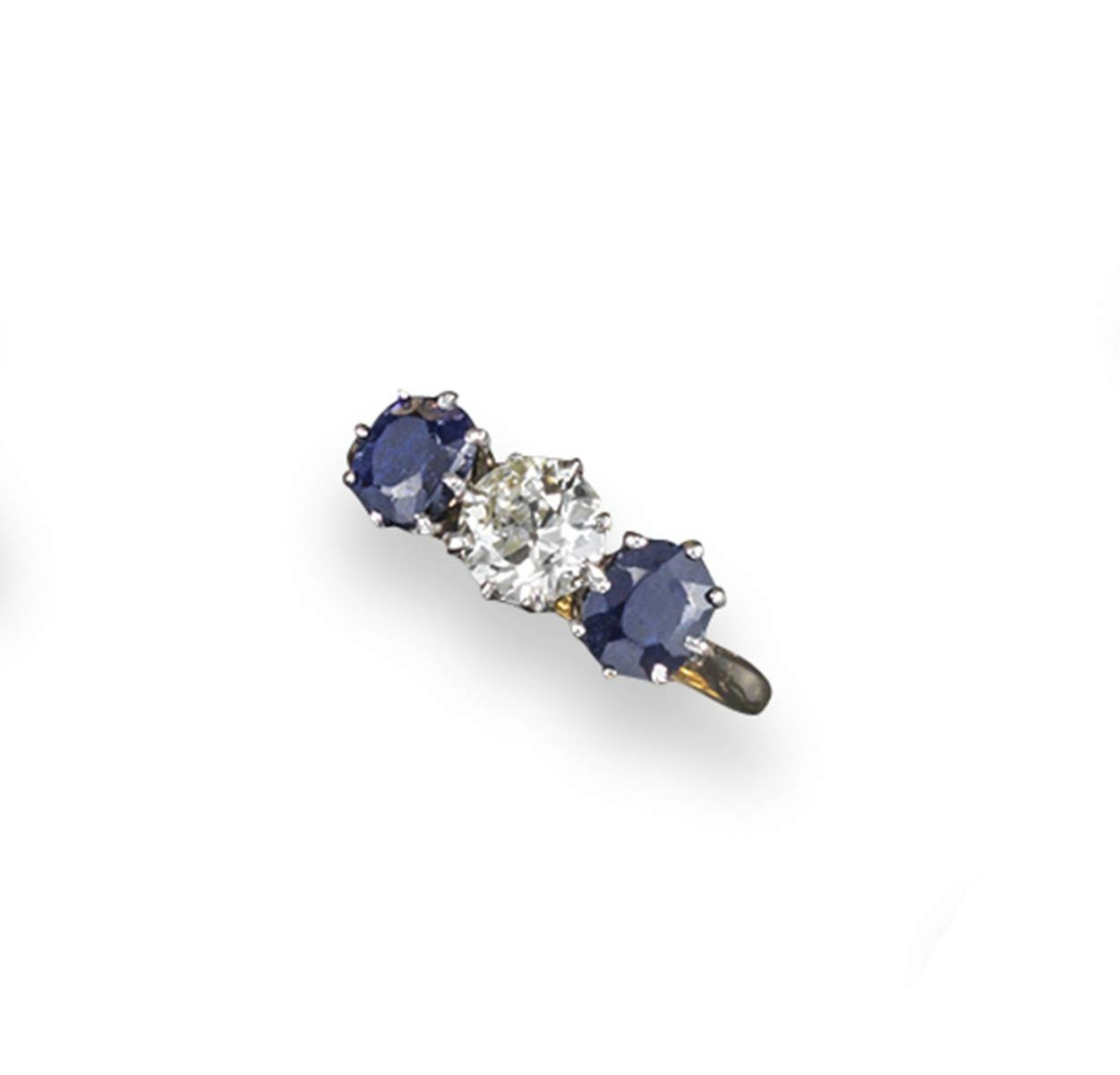 A diamond and sapphire three stone ring, the circular cut diamond is set with two oval shaped sapphires, in gold. Size M. Boxed.