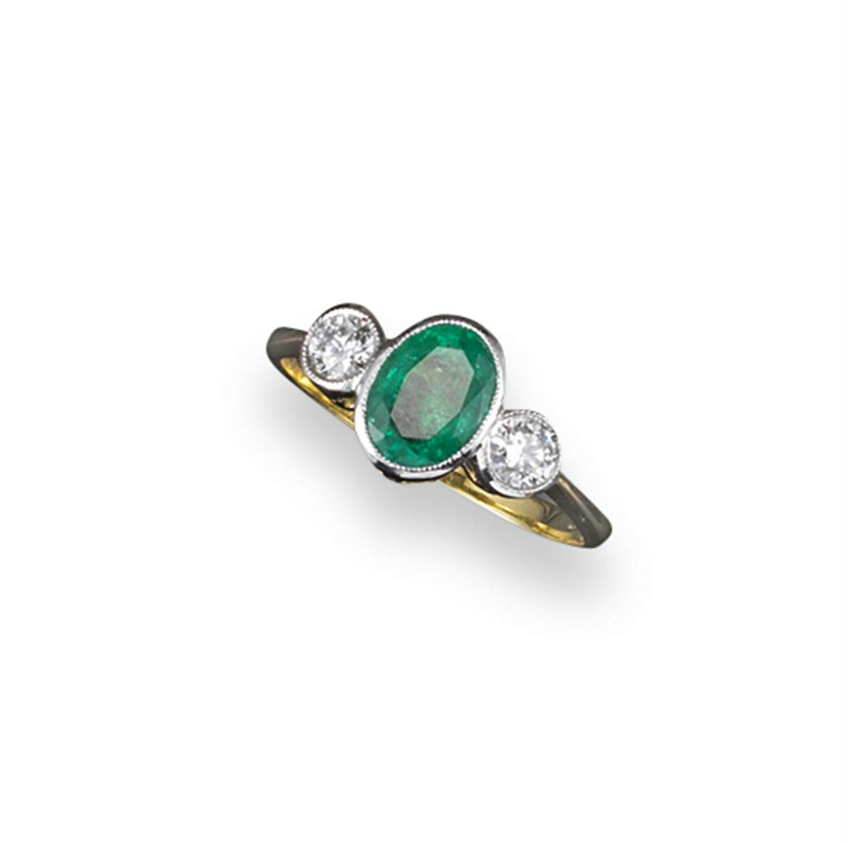 An emerald and diamond three stone ring, the oval-shaped emerald is set with two round brilliant cut diamonds in white gold. Size P 1/2.