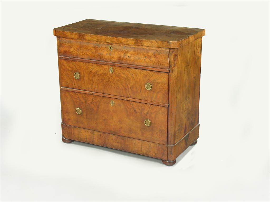 A 19th century continental walnut chest, the quarter veneered top above a shaped frieze drawer and two others, fitted later brasswork, 34.25in (87cm) h, 38.5in (98cm) w, 19.25in (49cm) d.