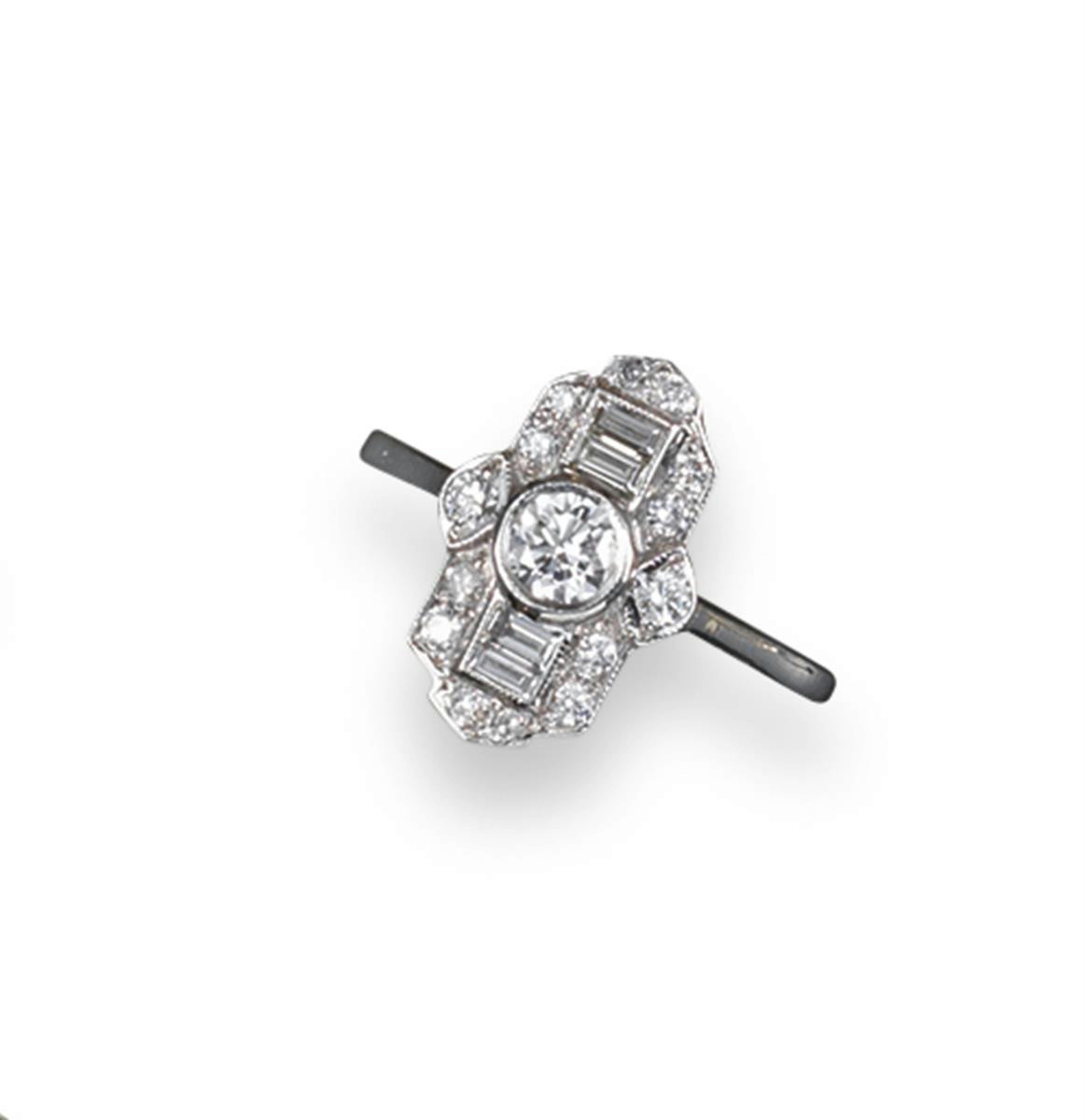 A diamond cluster ring, set with graduated brilliant-cut and baguette-shaped diamonds in white gold. Size O 1/2.