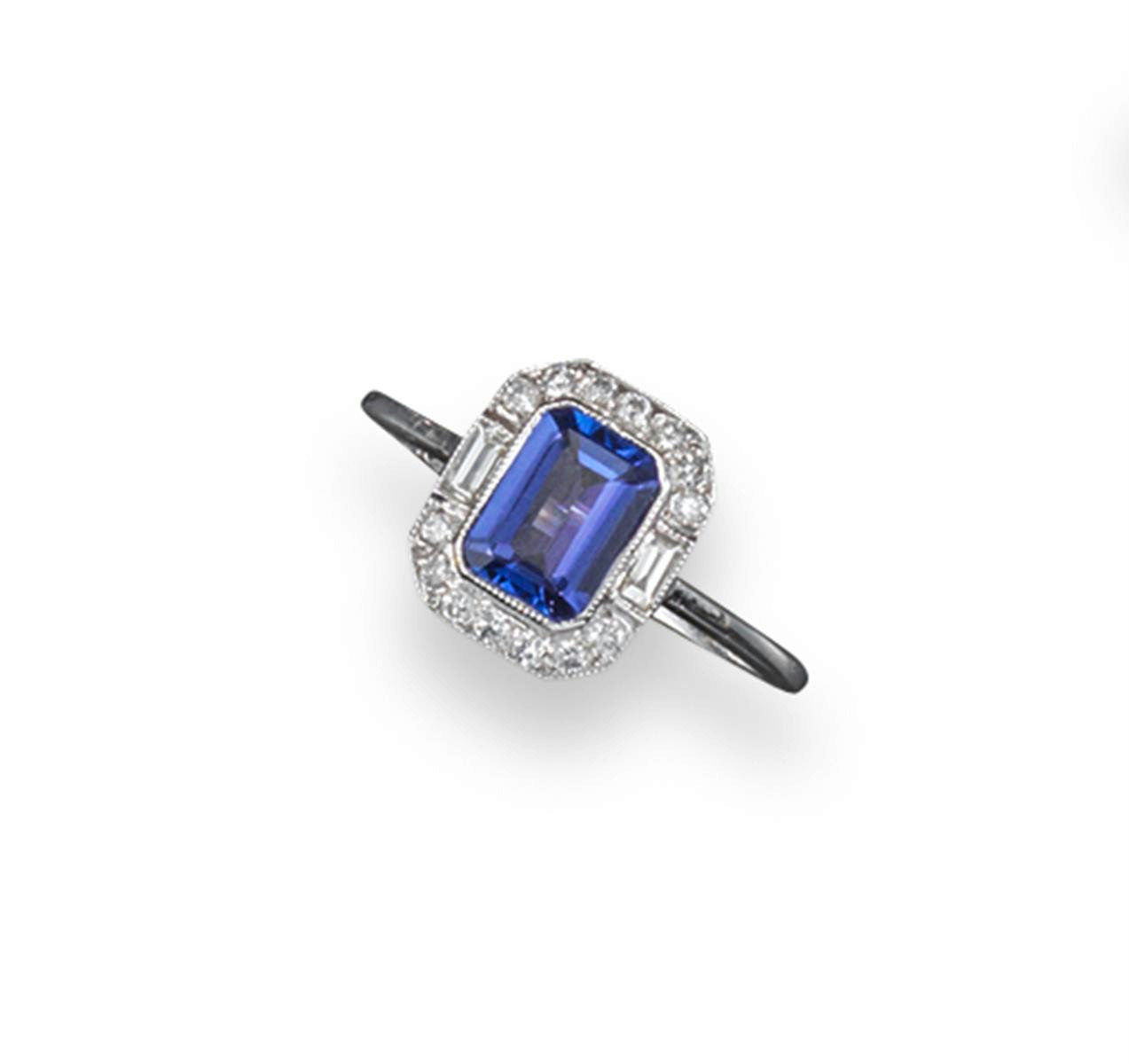 A tanzanite and diamond ring, the emerald-cut tanzanite is set within a surround of circular and baguette-shaped diamonds in white gold. Size M.