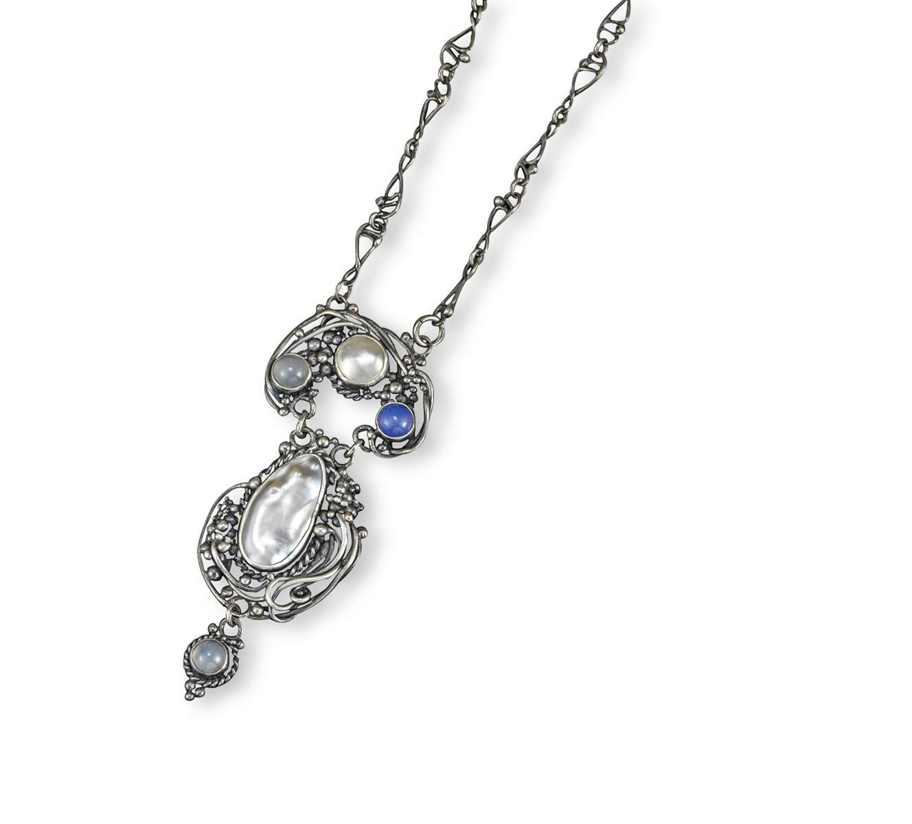 An Arts and Crafts pendant, set with blister pearls and three dyed chalcedony cabochons, of asymmetrical wirework and pellet form and suspended from a silver wirework necklace, the pendant 6cm high.