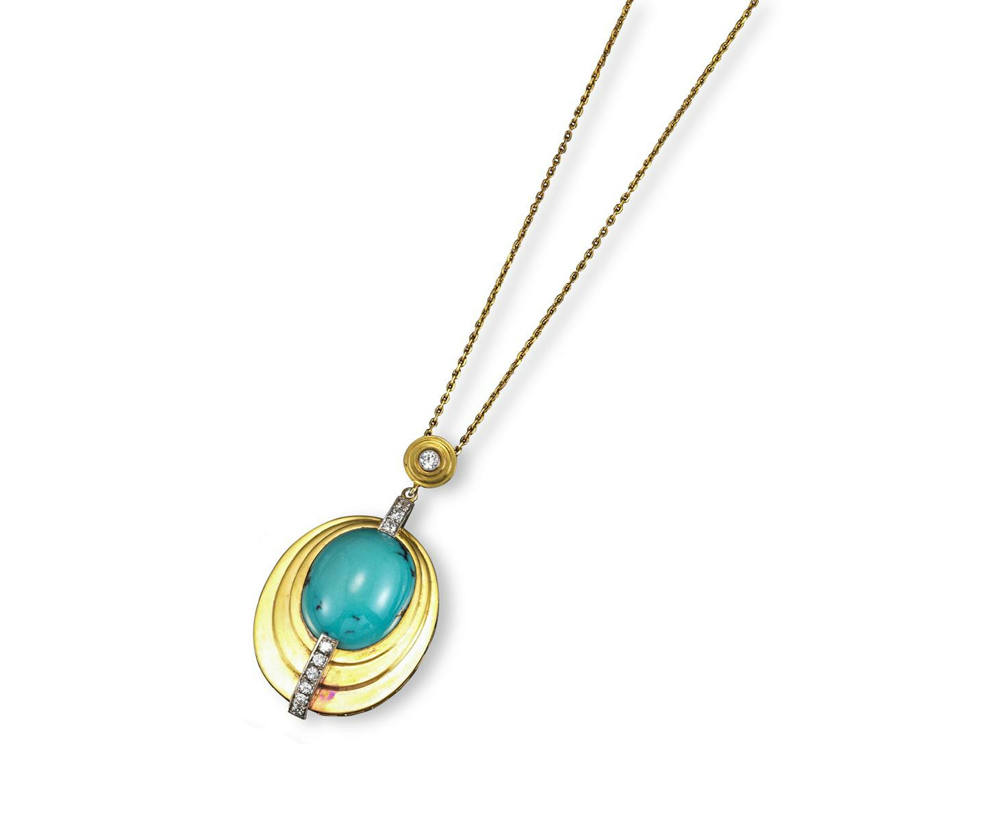 An Art Deco turquoise and diamond-set gold oval pendant, of geometric design the large oval turquoise cabochon is set within concentric gold surrounds and a line of diamonds, suspended from a diamond-set circular pendant on fine link gold neck chain. Marked D.A probably for David Anderson and T. L-J 585. The pendant 5.3cm long, the chain 50cm long.