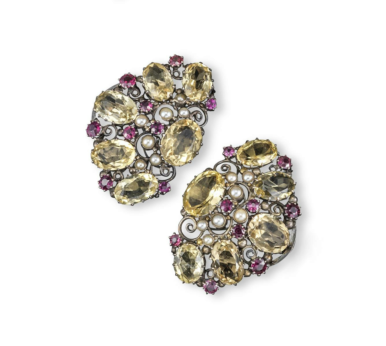 A pair of Arts and Crafts clip brooches in the style of Dorrie Nossiter, each mounted overall with graduated oval-shaped citrines, circular-cut rubies and pearls. Silver mounts. Each clip 5cm high.