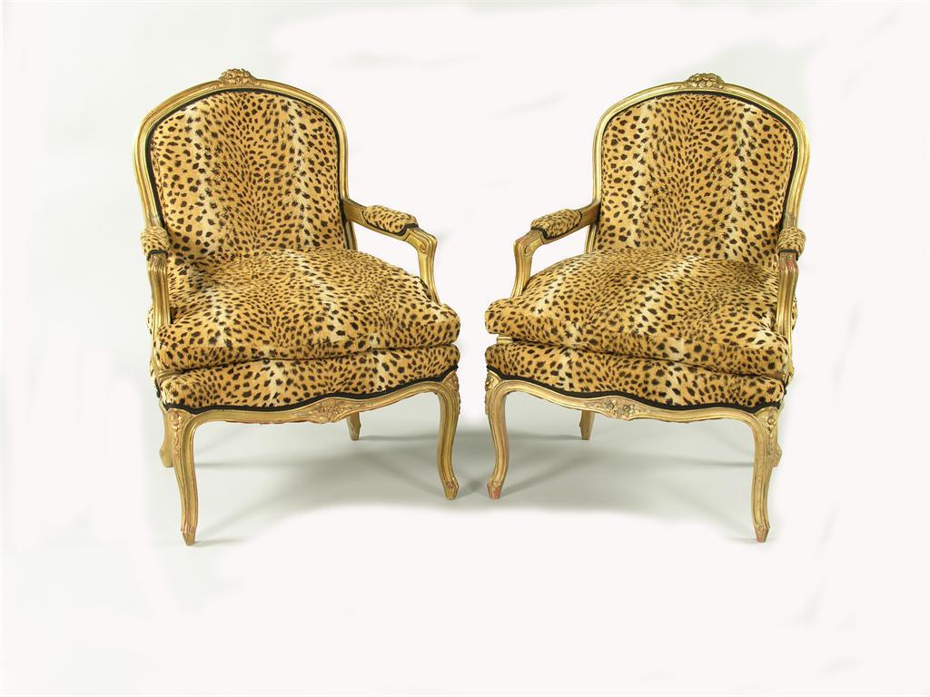 A pair of Louis XV style giltwood fauteuils, the carved and chanelled frames with leopard print upholstery, 20th century. (2)