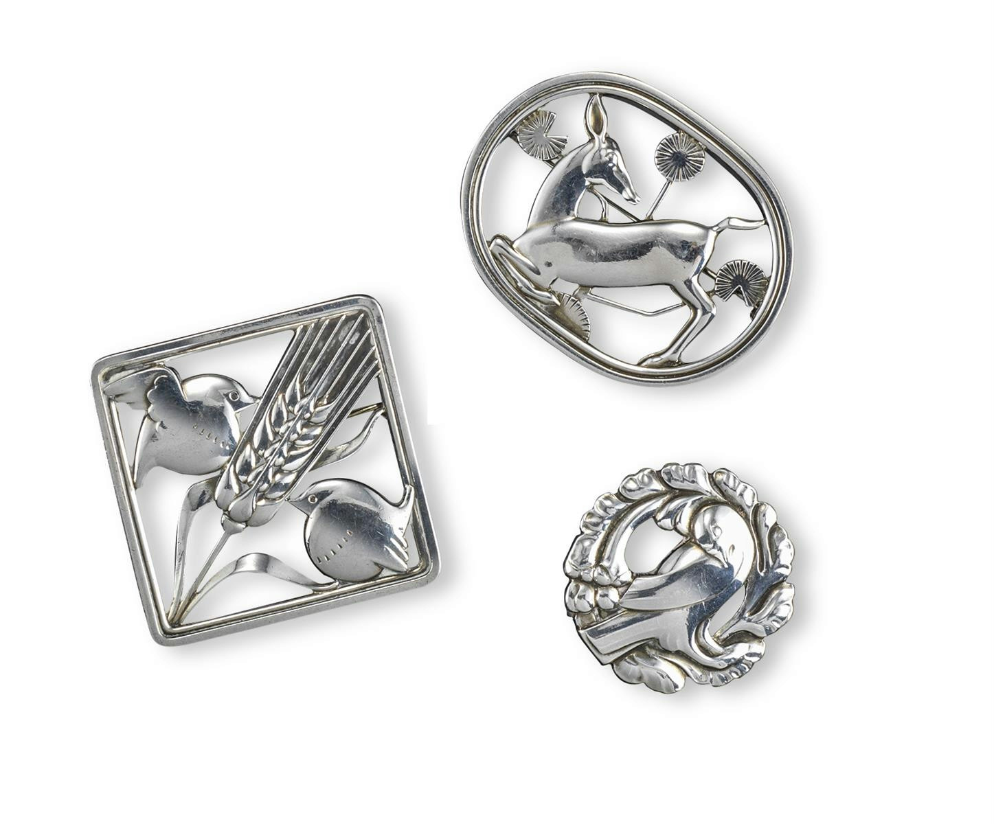A silver Kneeling Deer brooch by Georg Jensen, design no. 256, signed and London import mark 1974. 4.5cm wide. A silver circular bird brooch by Georg Jensen, design no. 134, signed and London import marks for 1975. 3cm wide. And a silver square form bird's on a wheatsheaf brooch by Georg Jensen, design no. 250, signed with London import marks for 1947. 5cm wide.