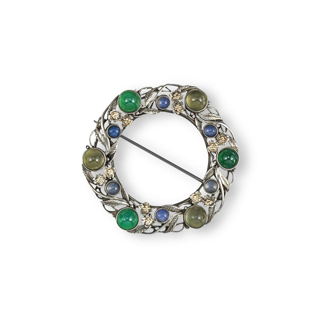 A Arts and Crafts circular brooch, mounted with dyed chalcedony cabochons and with pierced foliate decoration, in the manner of Henry Murphy. 3.5cm wide.